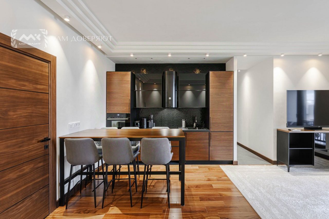 Квартира выполнена по авторскому проекту, использованы материалы класса LUX. Инженерная доска американский орех Select, двери из американского ореха, венецианская штукатурка на стенах (лучшее эко-покрытие!