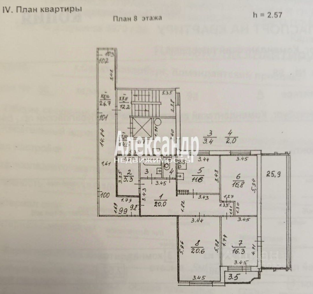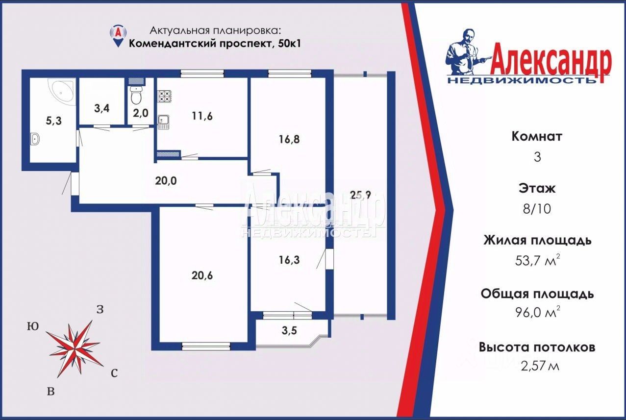 Общая фактическая (включая лоджию и балкон) площадь - 125,4 м.кв. Общая приведенная площадь квартиры - 110 м.кв. Общая площадь - 96 м.кв. Жилая площадь - 53,7 м.кв.: все три комнаты изолированные, правильной формы, просторные: - 16,8 м.кв. - 16,3 м.кв. - 20,6 м.кв. Кухня - 11,6 м.кв. Ванная - 5,3 м.кв. Туалет - 2 м.кв. Шикарный коридор, совмещенный с прихожей - 20 м.кв. Застекленная двухсторонняя лоджия - 25,9 м.кв. - фактически представляет собой еще одну - самую большую - комнату (сделан полноценный ремонт, утепление, проведено электричество)! Застекленный балкон - 3,5 м.кв.