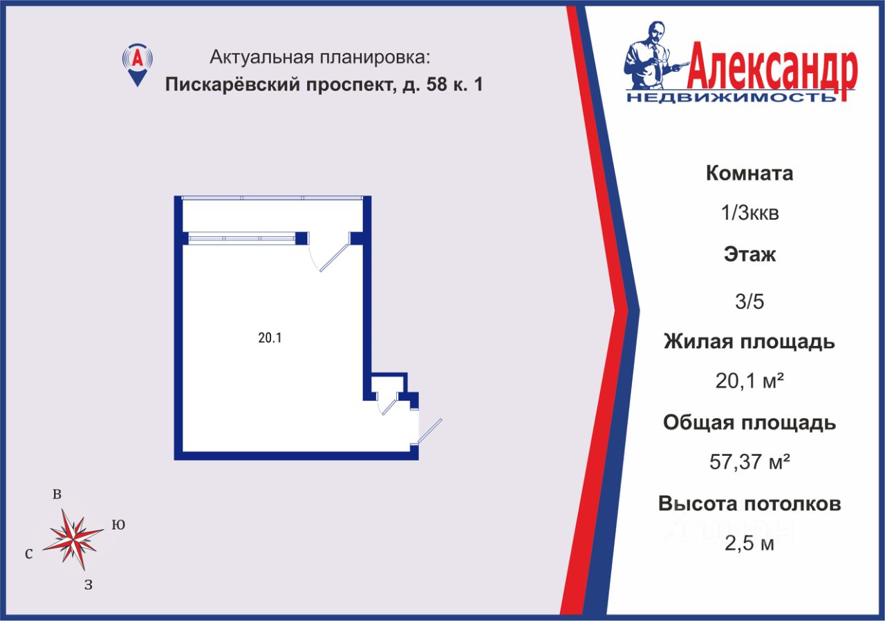 1699717 В Калининском районе СанктПетербурга продаётся просторная комната в трёхкомнатной квартире с небольшим числом соседей. - расположение: 3й этаж пятиэтажного дома, - площадь комнаты: 20,10 кв. м - общая площадь квартиры: 57,37 кв. м -кухня: 6 кв. м - раздельный санузел, - есть лоджия, - в комнате выполнен косметический ремонт, установлен балконный блок, - при входе в комнату — удобная кладовая. - в местах общего пользования недавно сделан косметический ремонт, жильцы поддерживают чистоту и порядок постоянно, - в квартире не курят, дом находится в зелёном квартале, придомовая территория ухоженная, тихая обстановка, окна выходят в зелёный двор, есть перспектива выкупа соседней комнаты или всей квартиры.