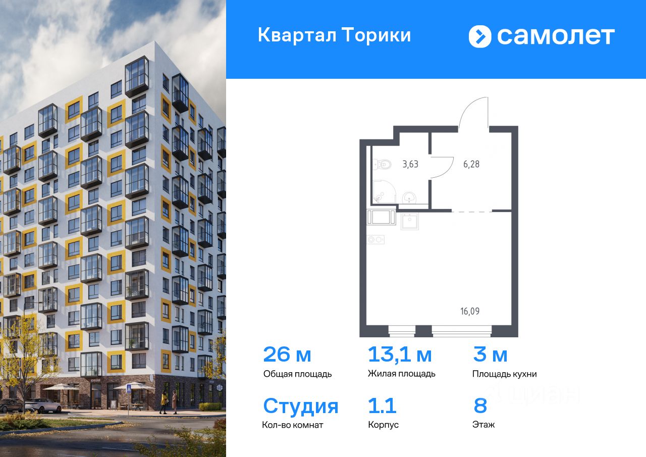 Предлагается квартира студия комфорт-класса 26 кв.м в корпусе 1.1 на 8 этаже, в ЖК ''Квартал Торики'' Квартира без отделки. Доступность опции ''отделка'' и возможность комплектации мебелью и декором уточняйте у застройщика.