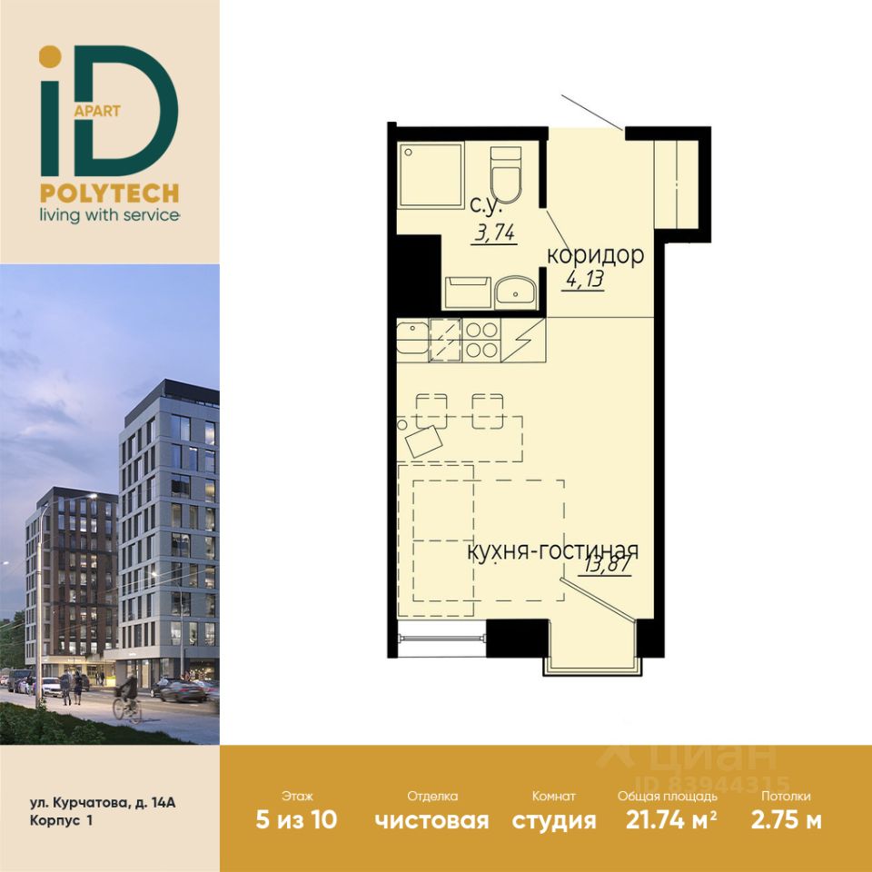 В продаже стильная эргономичная студия с готовой отделкой в эксклюзивном апарт-комплексе iD Polytech.
