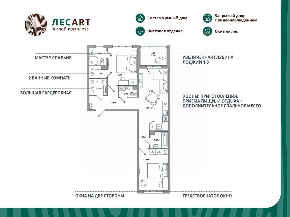 РАСПОЛОЖЕНИЕ И БЛАГОУСТРОЙСТВО Расположение ЖК ''ЛесART'' порадует любителей чистого воздуха — рядом находятся лесопитомник и Шунгеровский заказник. Особенность комплекса это его ART дворы, которые оформлены по мотивам произведений Василия Кандинского, Пита Мондриана и Пабло Пикассо. Дворы закрыты от машин, что обеспечивает безопасность детей и взрослых. Для семей с детьми особенно удобно наличие детского сада и школы прямо во дворе комплекса. На первом этаже расположены магазины, маркетплейсы, кофейни и всё что необходимо для повседневной жизни. Холлы - это продуманные пространства с колясочными, сквозными проходами и приятной музыкой в лифтах. СИСТЕМА УМНОГО ДОМА В КАЖДОЙ КВАРТИРЕ - Комфорт. Управление освещением, мультимедиа и климат-контролем. - Безопасность. Видеонаблюдение и мониторинг систем безопасности. - Экономия. Контроль систем и оптимизация энергопотребления. - Удобство. Управление с помощью мобильного телефона. ГК ''ЕДИНО'' Входит в тройку компаний-лидеров региона по потребительским качествам жилых комплексов, объемам ввода жилья и объемам текущего строительства. В цифрах: -23 года на рынке -Более 50 построенных домов -60 000+ счастливых обладателей квартир