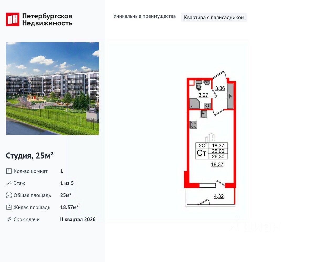 Уникальная, функциональная европланировка, просторная прихожая 3.36 м². Общая площадь студии - 25 м², жилая 18.37 м², высота потолка 2.77 м.