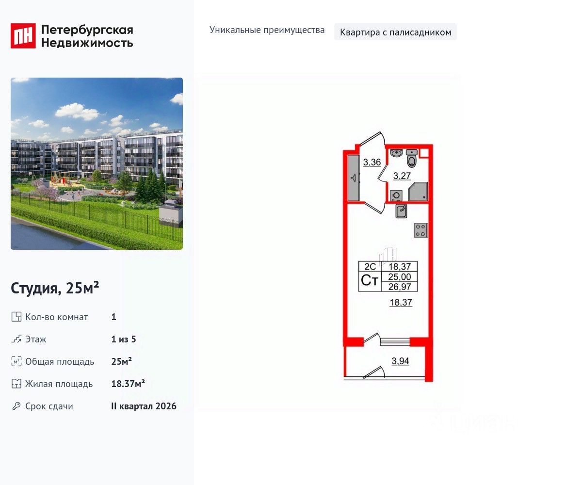 Уникальная, функциональная европланировка, просторная прихожая 3.36 м². Общая площадь студии - 25 м², жилая 18.37 м², высота потолка 2.77 м.