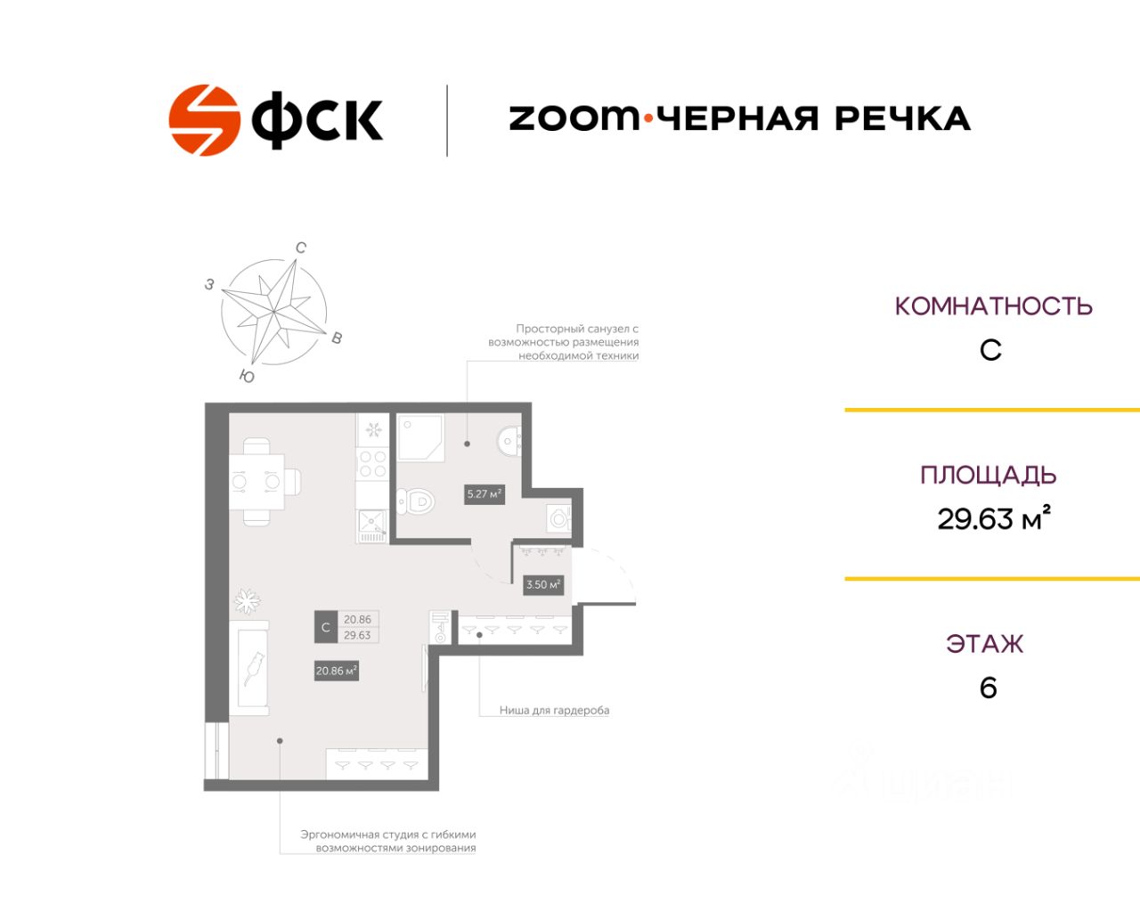 Цена со специальной скидкой в прямой продаже от застройщика — только в этом месяце. Апартамент-студия в комплексе класса бизнес-лайт Zoom Чёрная Речка на 6-м этаже. Общая площадь 29,63. Предчистовая отделка.