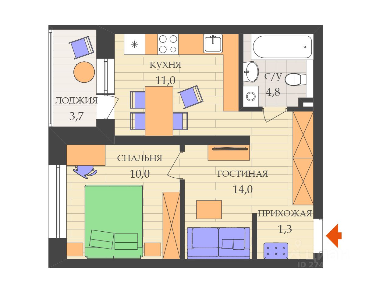 По планировке - кухня, проходная гостиная с диваном-кроватью и спальная комната с двуспальной кроватью, лоджия. Из окон открывается вид на Адмиралтейский район. Есть возможность арендовать место в подземном паркинге. - площадь кухни 11 кв.м, - площадь спальни 10 кв.м, - площадь гостиной 14,3 кв.м.,