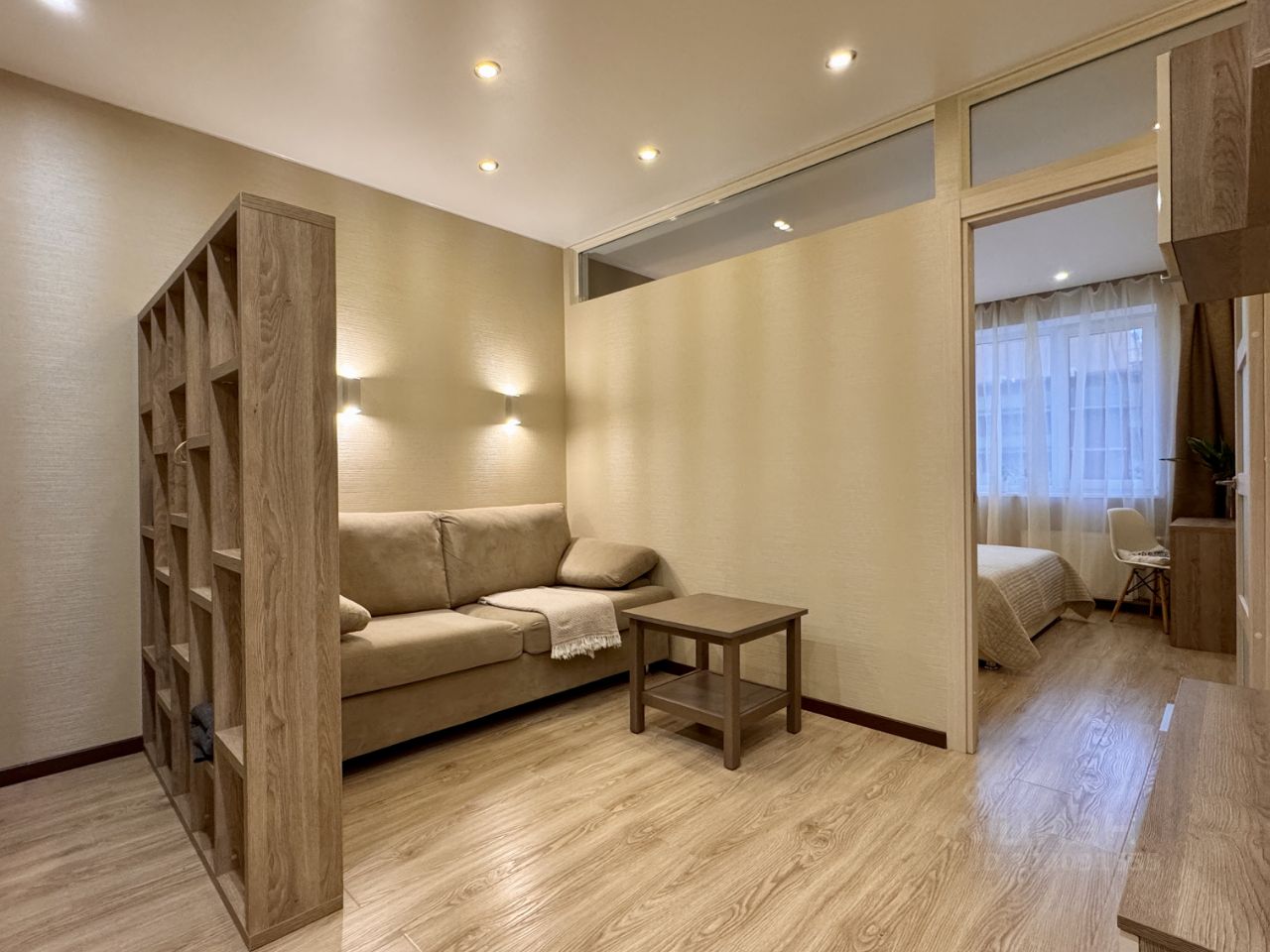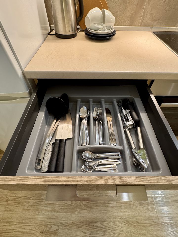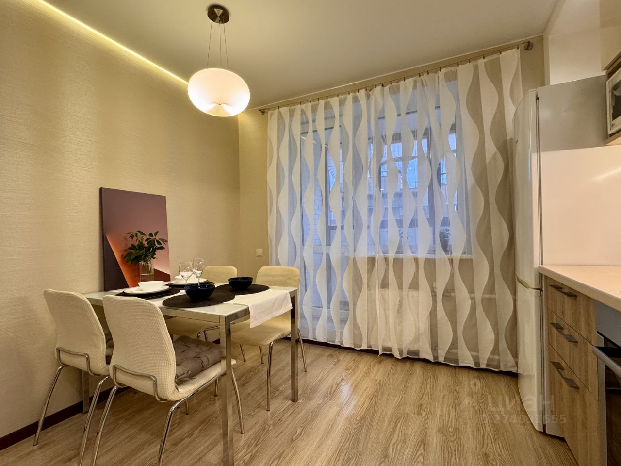 По планировке - кухня, проходная гостиная с диваном-кроватью и спальная комната с двуспальной кроватью, лоджия. Из окон открывается вид на Адмиралтейский район. Есть возможность арендовать место в подземном паркинге. - площадь кухни 11 кв.м, - площадь спальни 10 кв.м, - площадь гостиной 14,3 кв.м.