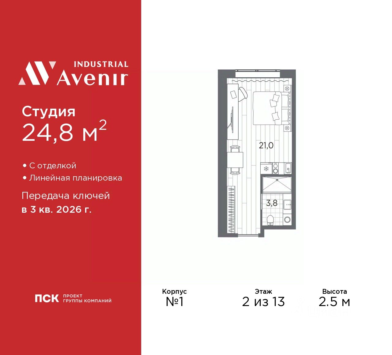 Просторные 1-комн. апартаменты-студия с отделкой в ЖК ''Industrial AVENIR'' на 2 этаже. Общая площадь: 24.8 кв.м., площадь гостиной 21 кв.м., из которых 5 кв.м. выделено под кухонную зону. Все окна выходят на одну сторону. В апартаментах один совмещенный санузел. Высота потолков 2.5 м.