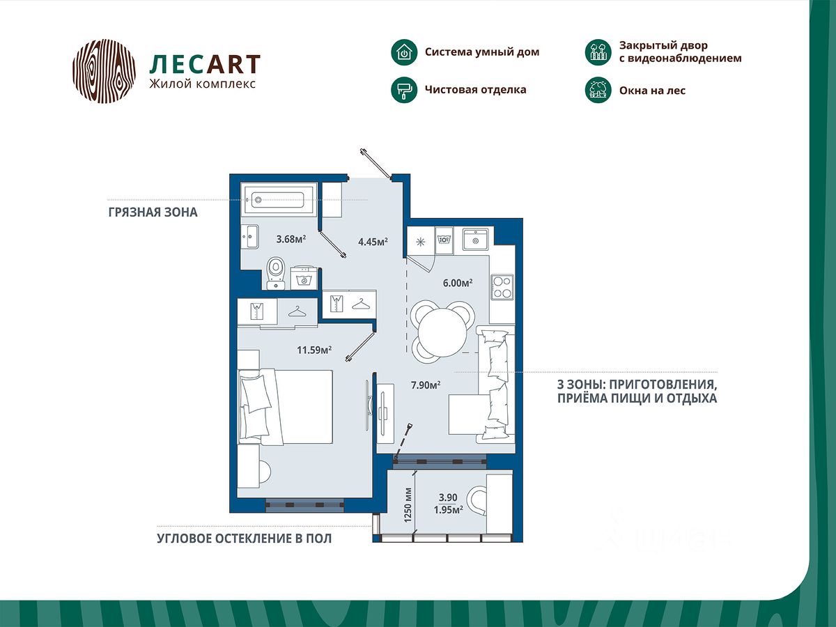 РАСПОЛОЖЕНИЕ И БЛАГОУСТРОЙСТВО Расположение ЖК ''ЛесART'' порадует любителей чистого воздуха — рядом находятся лесопитомник и Шунгеровский заказник. Особенность комплекса это его ART дворы, которые оформлены по мотивам произведений Василия Кандинского, Пита Мондриана и Пабло Пикассо. Дворы закрыты от машин, что обеспечивает безопасность детей и взрослых. Для семей с детьми особенно удобно наличие детского сада и школы прямо во дворе комплекса. На первом этаже расположены магазины, маркетплейсы, кофейни и всё что необходимо для повседневной жизни. Холлы - это продуманные пространства с колясочными, сквозными проходами и приятной музыкой в лифтах. СИСТЕМА УМНОГО ДОМА В КАЖДОЙ КВАРТИРЕ - Комфорт. Управление освещением, мультимедиа и климат-контролем. - Безопасность. Видеонаблюдение и мониторинг систем безопасности. - Экономия. Контроль систем и оптимизация энергопотребления. - Удобство. Управление с помощью мобильного телефона. ГК ''ЕДИНО'' Входит в тройку компаний-лидеров региона по потребительским качествам жилых комплексов, объемам ввода жилья и объемам текущего строительства. В цифрах: -23 года на рынке -Более 50 построенных домов -60 000+ счастливых обладателей квартир