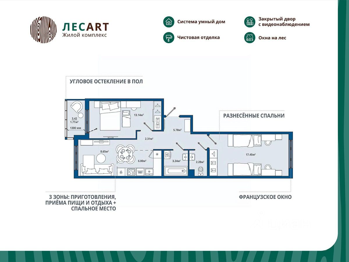 РАСПОЛОЖЕНИЕ И БЛАГОУСТРОЙСТВО Расположение ЖК ''ЛесART'' порадует любителей чистого воздуха — рядом находятся лесопитомник и Шунгеровский заказник. Особенность комплекса это его ART дворы, которые оформлены по мотивам произведений Василия Кандинского, Пита Мондриана и Пабло Пикассо. Дворы закрыты от машин, что обеспечивает безопасность детей и взрослых. Для семей с детьми особенно удобно наличие детского сада и школы прямо во дворе комплекса. На первом этаже расположены магазины, маркетплейсы, кофейни и всё что необходимо для повседневной жизни. Холлы - это продуманные пространства с колясочными, сквозными проходами и приятной музыкой в лифтах. СИСТЕМА УМНОГО ДОМА В КАЖДОЙ КВАРТИРЕ - Комфорт. Управление освещением, мультимедиа и климат-контролем. - Безопасность. Видеонаблюдение и мониторинг систем безопасности. - Экономия. Контроль систем и оптимизация энергопотребления. - Удобство. Управление с помощью мобильного телефона. ГК ''ЕДИНО'' Входит в тройку компаний-лидеров региона по потребительским качествам жилых комплексов, объемам ввода жилья и объемам текущего строительства. В цифрах: -23 года на рынке -Более 50 построенных домов -60 000+ счастливых обладателей квартир