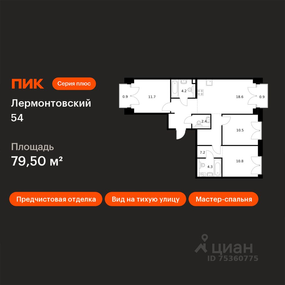 Продаётся 3-комн. квартира площадью 79,5 кв.м на 5 этаже 9 этажного дома (Корпус 1, Секция 4) проекта ПИК Лермонтовский 54. Светлый просторный подъезд на уровне земли, функциональная планировка, большие окна, предчистовая отделка.
