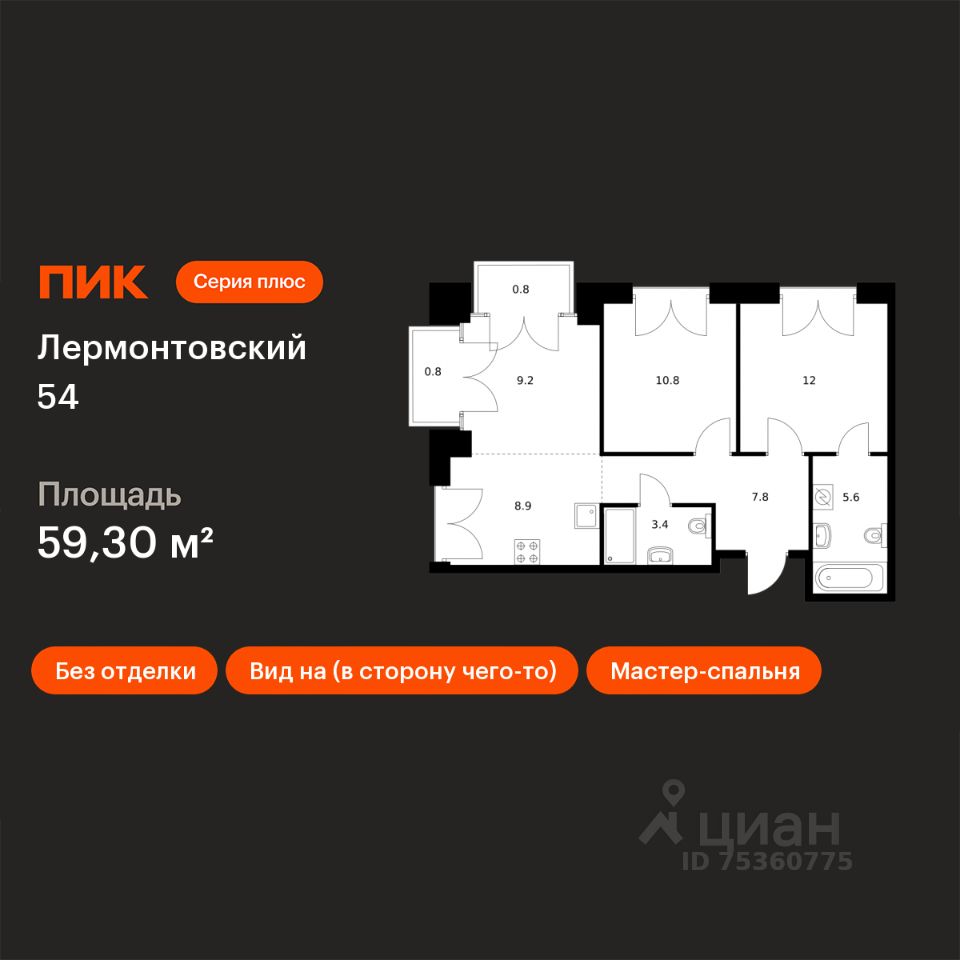 Продаётся 2-комн. квартира площадью 59,3 кв.м на 2 этаже 7 этажного дома (Корпус 2.2, Секция 8) проекта ПИК Лермонтовский 54. Светлый просторный подъезд на уровне земли, функциональная планировка, большие окна, без отделки.