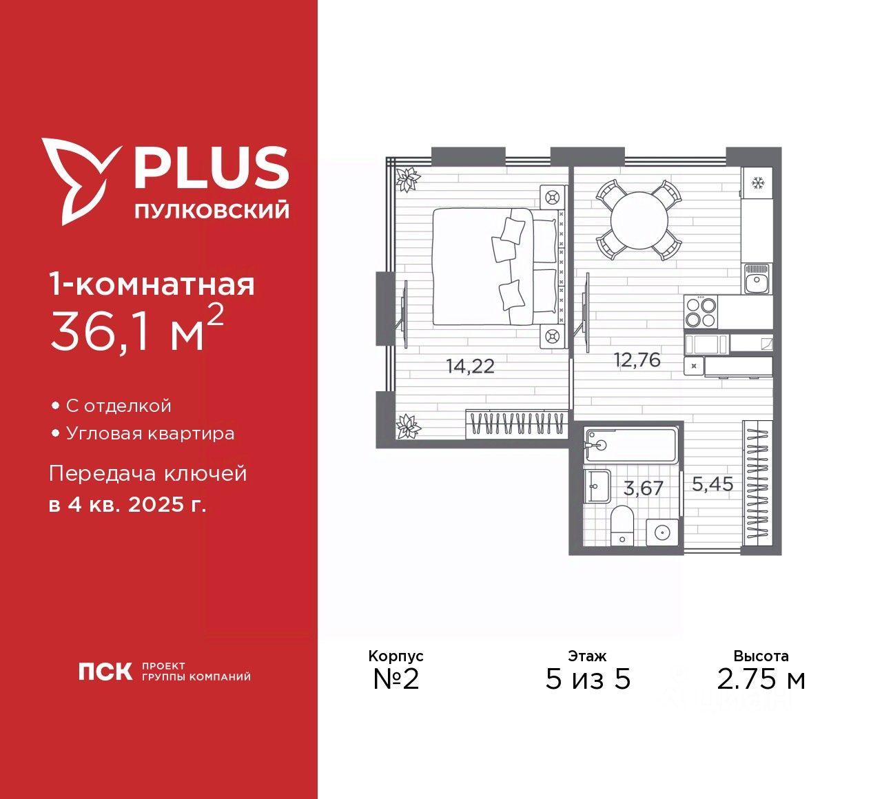 Продается 1-комн. квартира с отделкой в ЖК ''PLUS Пулковский'' на 5 этаже. Общая площадь: 36.1 кв.м., жилая: 14.22 кв.м., площадь просторной кухни-столовой: 12.76 кв.м. Угловая квартира, очень светлая, естественная вентиляция при открытии окон. В квартире один совмещенный санузел. Высота потолков 2.75 м.