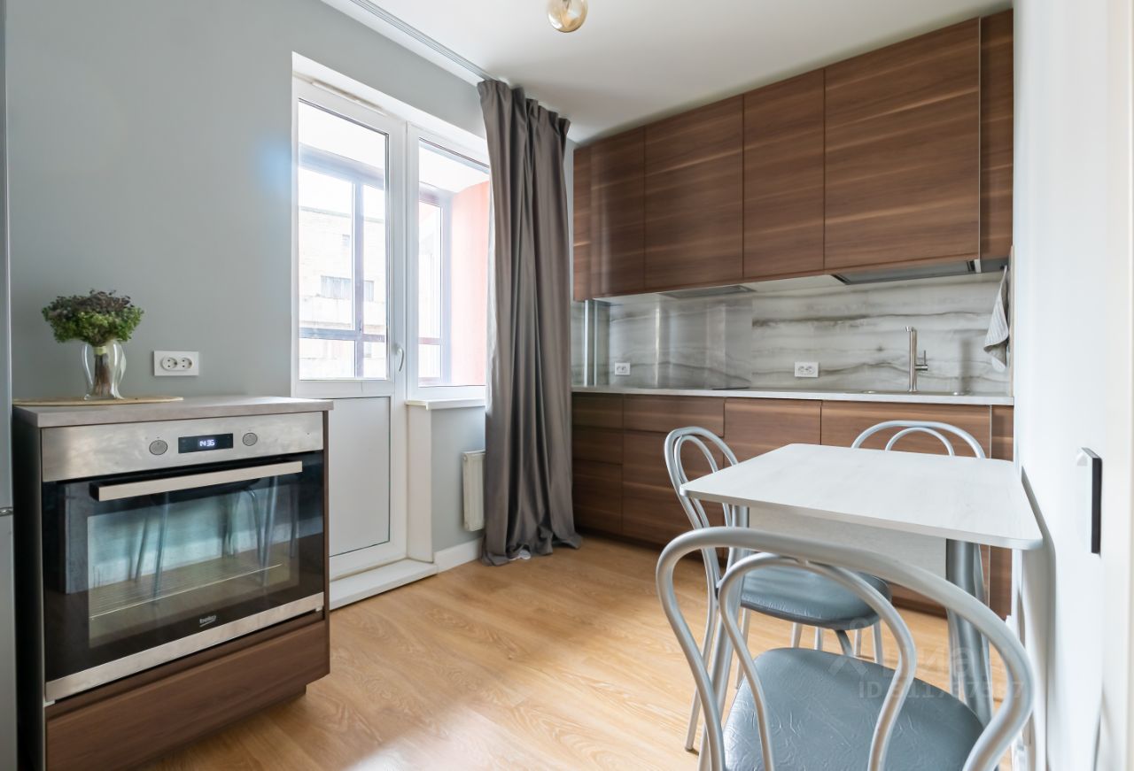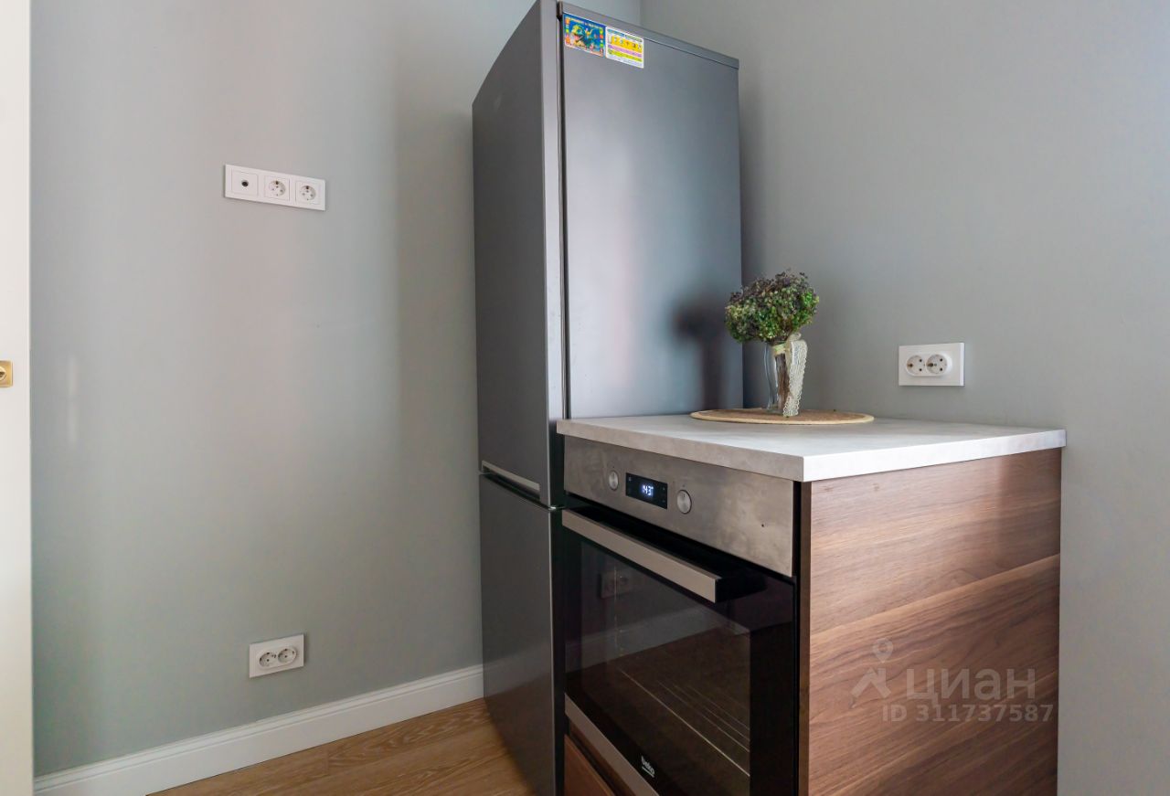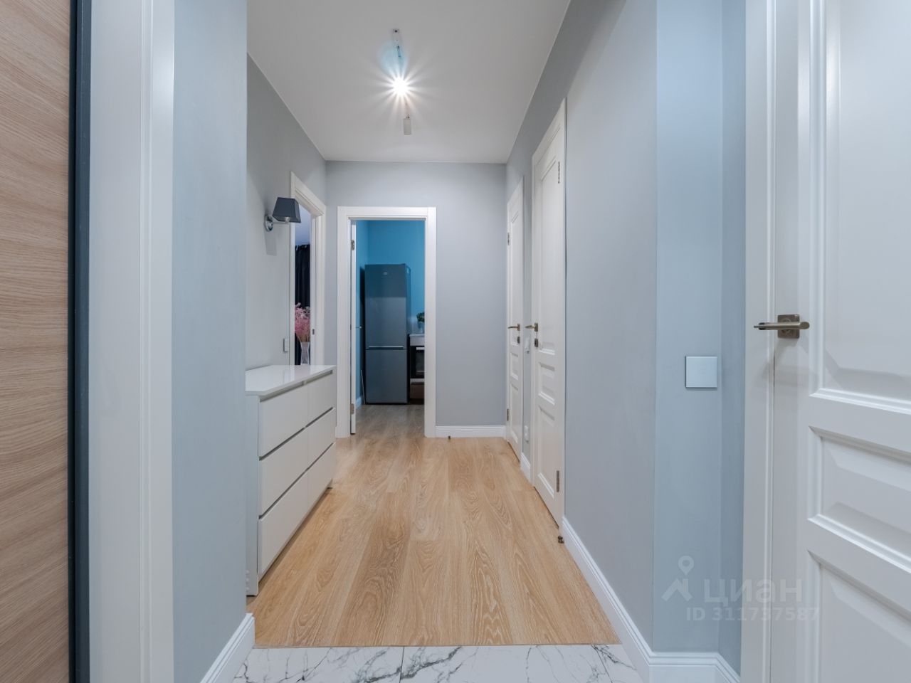 Квартира в отличном состоянии, выполнен качественный ремонт в светлых тонах. По планировке просторная спальная комната 18,5 метров, смежная с маленькой комнатой 6,5 метров, из которой можно сделать или вторую гардеробную или кабинет. Отдельная кухня с выходом на застекленную лоджию, раздельный санузел с ванной, гардеробная комната при входе в квартиру. Есть вся необходимая мебель и бытовая техника.