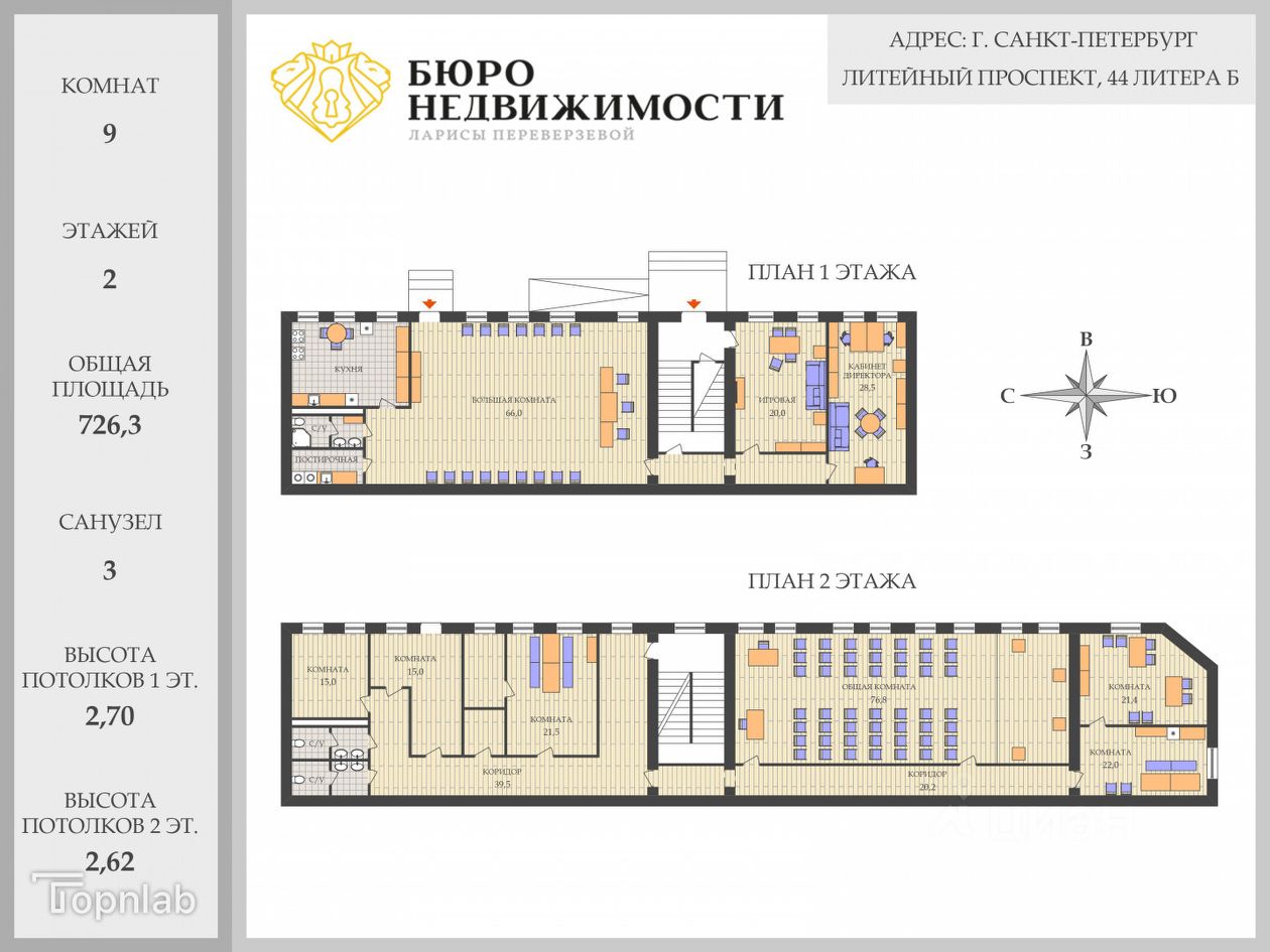 Отличная цена, интересный объект! Литейный, 44 б. Нежилые помещения на 1-м и 2-м этажах с подвалом в двухэтажном нежилом здании общей продаваемой площадью 726,3 м2.
