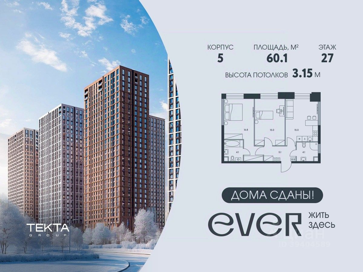 3-комн. квартира в ЖК ''Ever'' на 27 этаже в 34 этажном здании Корпус 5. Общая площадь: 60.1 кв.м., жилая: 41.9 кв.м. Высота потолков 3.15 м.