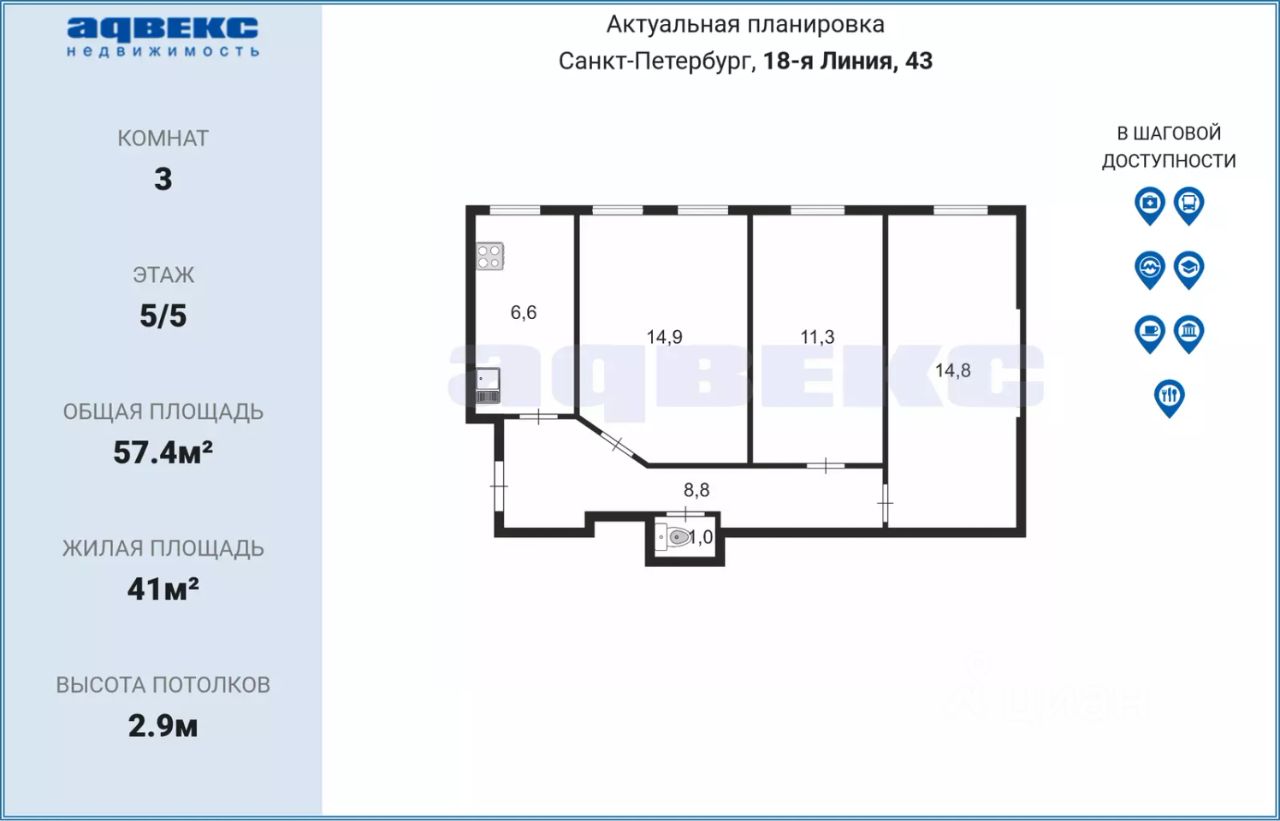 продам 3-к, 18-я В.О. линия, 439 900 000 ₽