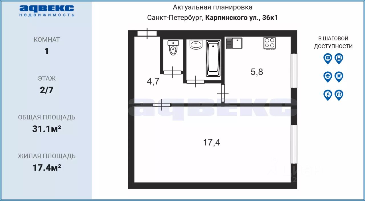 Предлагается к продаже 1-комнатная квартира в зеленом районе нашего города. В пешей доступности есть все необходимое: магазины, аптеки, кафе, детский сад, детская площадка, школа, остановка общественного транспорта.
