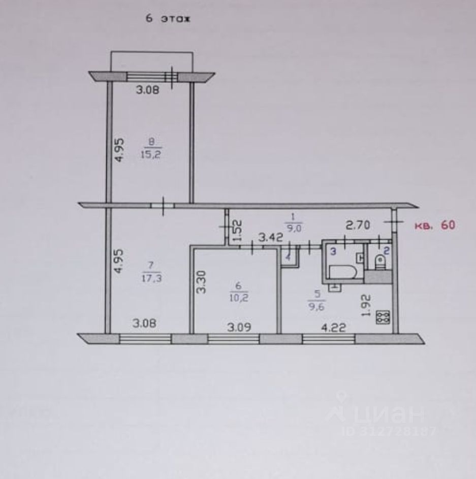 общ пл. квартиры :66.1, жилая: 42.7, по комнатам: 17.3, 15.2, 10.2, кухня 9 , балкон, высота потолков 2.7