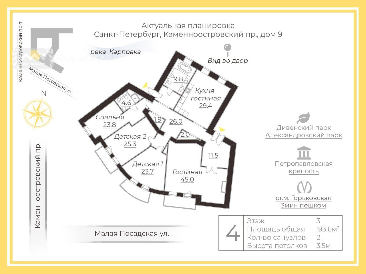 Арт. 3351066 Великолепная четырехкомнатная квартира с изысканным ремонтом и рациональной планировкой в бывшем доходном доме купца Быховского. Дом в стиле неоренессанс построен архитектором М.С. Ляличевым в 1911 году. Расположен в трех минутах от станции метро Горьковская и Александровского парка. В шаговой доступности школы, магазины, рестораны, кинотеатр, зоопарк и многие городские достопримечательности. Планировка квартиры включает в себя 3 спальные комнаты, просторную гостиную, где у камина приятно можно скоротать время всей семьей и кухню-столовую, две вместительные ванные комнаты: одна из которых площадью более 10 квадратных метров с окном выходящим в тихий двор, а вторая расположена в родительской спальне, а также множество помещений для хранения и гардеробные комнаты. Окна квартиры обращены на три стороны света, подавляющее большинство из них смотрит в южном и западном направлении. Благодаря этому, а также высоким потолкам (3.4 метра) в квартире даже в самый пасмурный день достаточно света. В квартиру ведет красивая и ухоженная парадная лестница, которая оснащена современным лифтом OTIS. В закрытом дворе закреплено два парковочных места. Видеонаблюдение. За спокойствием жильцов парадной следит консьерж. Д