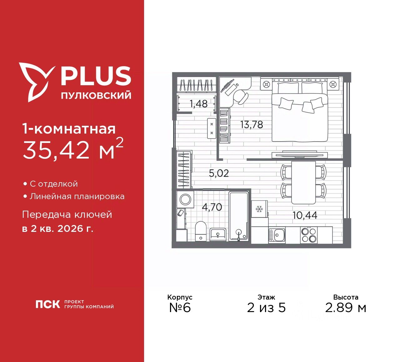Продается 1-комн. квартира с отделкой в ЖК ''PLUS Пулковский'' на 2 этаже. Общая площадь: 35.42 кв.м., жилая: 13.78 кв.м., площадь просторной кухни-столовой: 10.44 кв.м. Все окна выходят на одну сторону. В квартире один совмещенный санузел. Высота потолков 2.89 м.