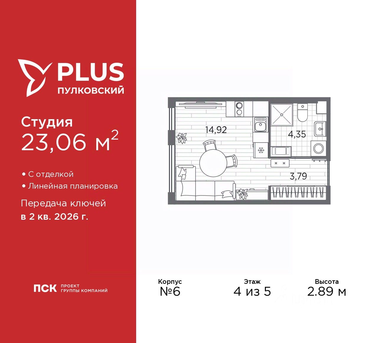 Просторная однокомнатная квартира-студия с отделкой в ЖК ''PLUS Пулковский'' на 4 этаже. Общая площадь: 23.06 кв.м., площадь гостиной 14.92 кв.м., из которых 5 кв.м. выделено под кухонную зону. Все окна выходят на одну сторону. В квартире один совмещенный санузел. Высота потолков 2.89 м.