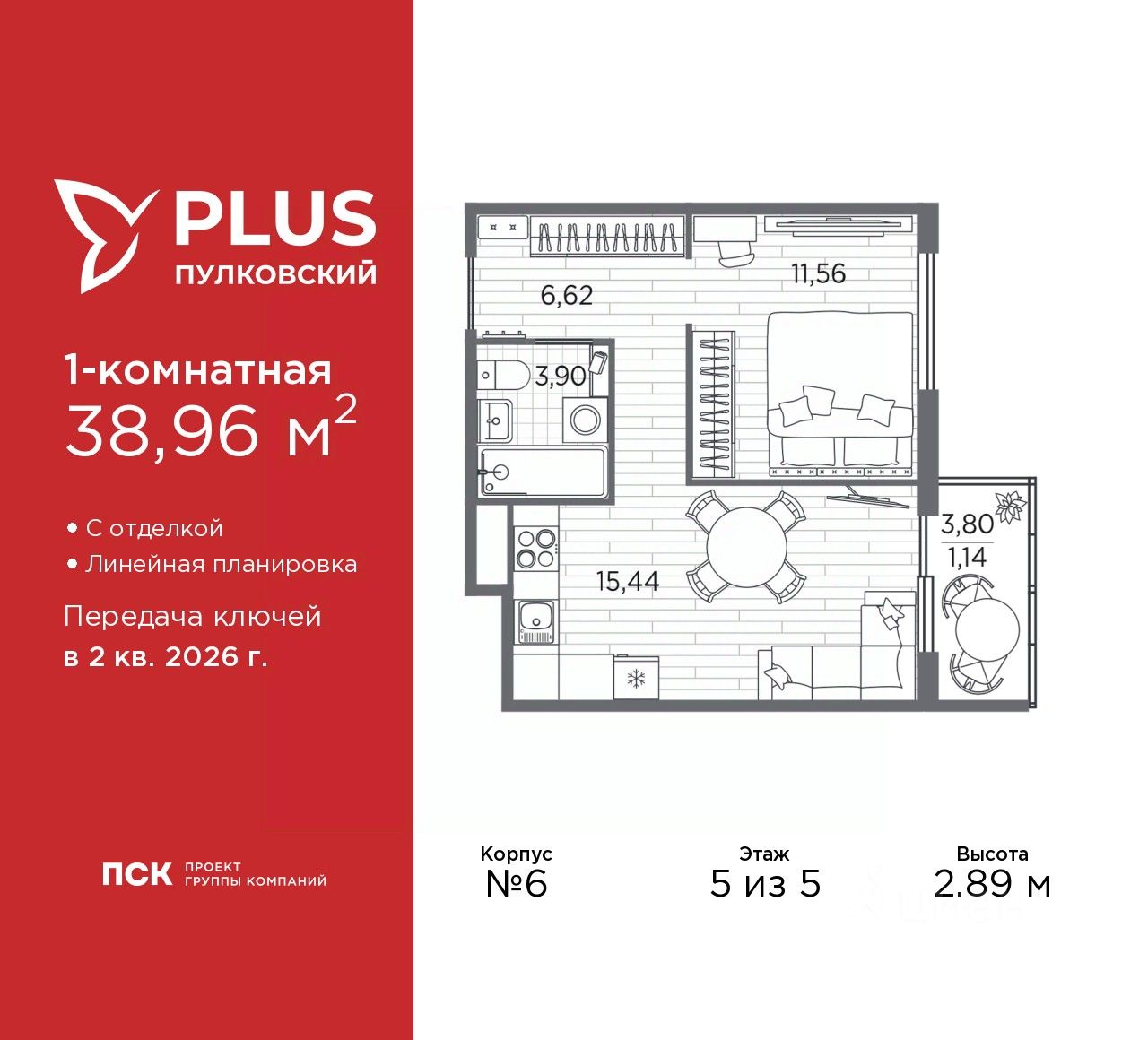 1-комн. квартира от застройщика с отделкой в ЖК ''PLUS Пулковский'' на 5 этаже. Общая площадь: 38.96 кв.м., жилая: 11.56 кв.м., площадь просторной кухни-столовой: 15.74 кв.м. Все окна выходят на одну сторону. В квартире один балкон, один совмещенный санузел. Высота потолков 2.89 м.