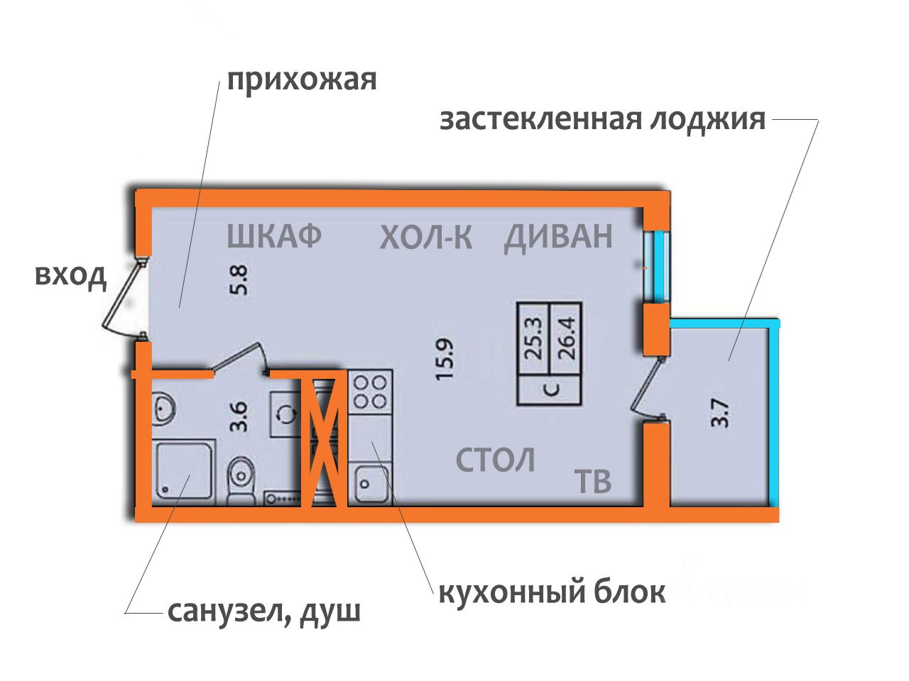 Раскладной двухспальный диван, большой шкаф, прихожая, телевизор.