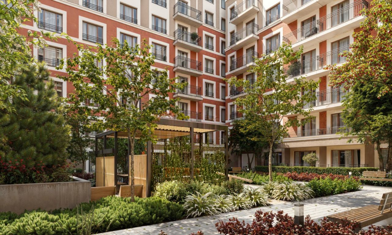 Двор с выходом в сквер Двор - это приватное пространство для жителей, закрытое от машин. В нём спроектированы детская и спортивная площадки, выполненные из натуральных материалов, а также зоны отдыха. Прямой выход в городской сквер расширяет функционал двора. Жители смогут быстро попадать в общественную зону с фонтаном, детскими и спортивными площадками и местами для отдыха. Большую часть территории двора занимает зелень. Озеленение выполнено в стиле пэчворк, и вдохновлено техникой лоскутного шитья. Отдельные фрагменты ландшафта, подобно лоскутам, гармонично складываются в планировочные элементы, а затем формируют цельную композицию. Растения представлены различными видами деревьев, кустарников, а также цветущими многолетниками. Зелень и стены дом