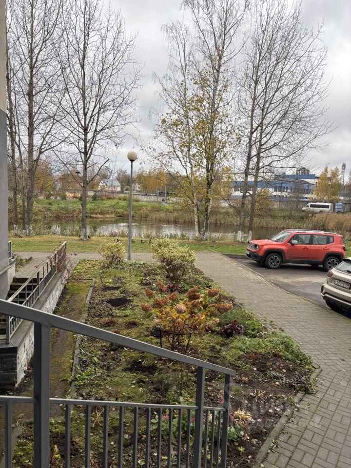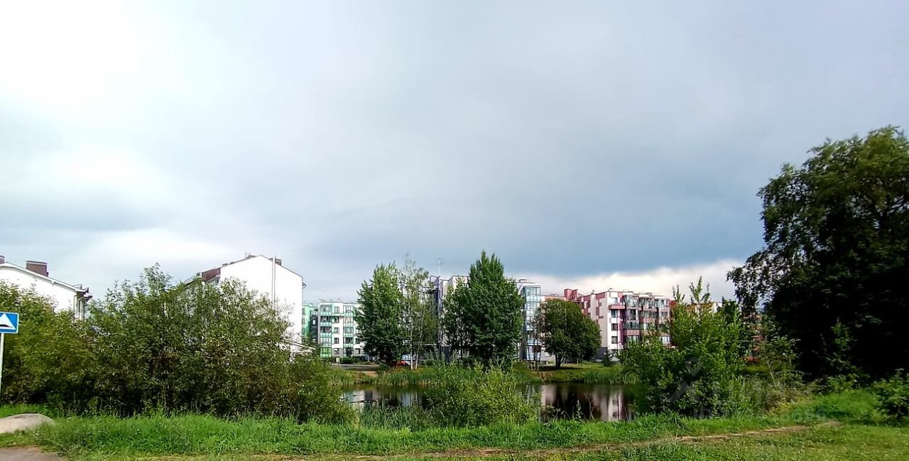 Во дворе детская площадка, пруд, просторная парковка.