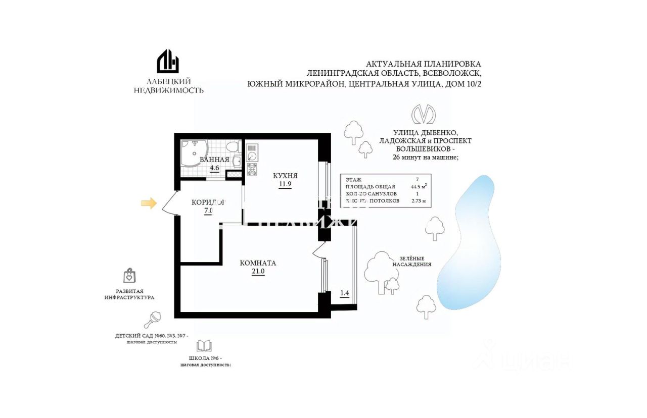 В ПЕШЕЙ доступности находятся школа и детский сад, продуктовые магазины, аптеки, СДЕК, пекарни, кафе, ветеринарная клиника, стоматология, Инвитро, салоны красоты, дом отдыха, парк и озеро.