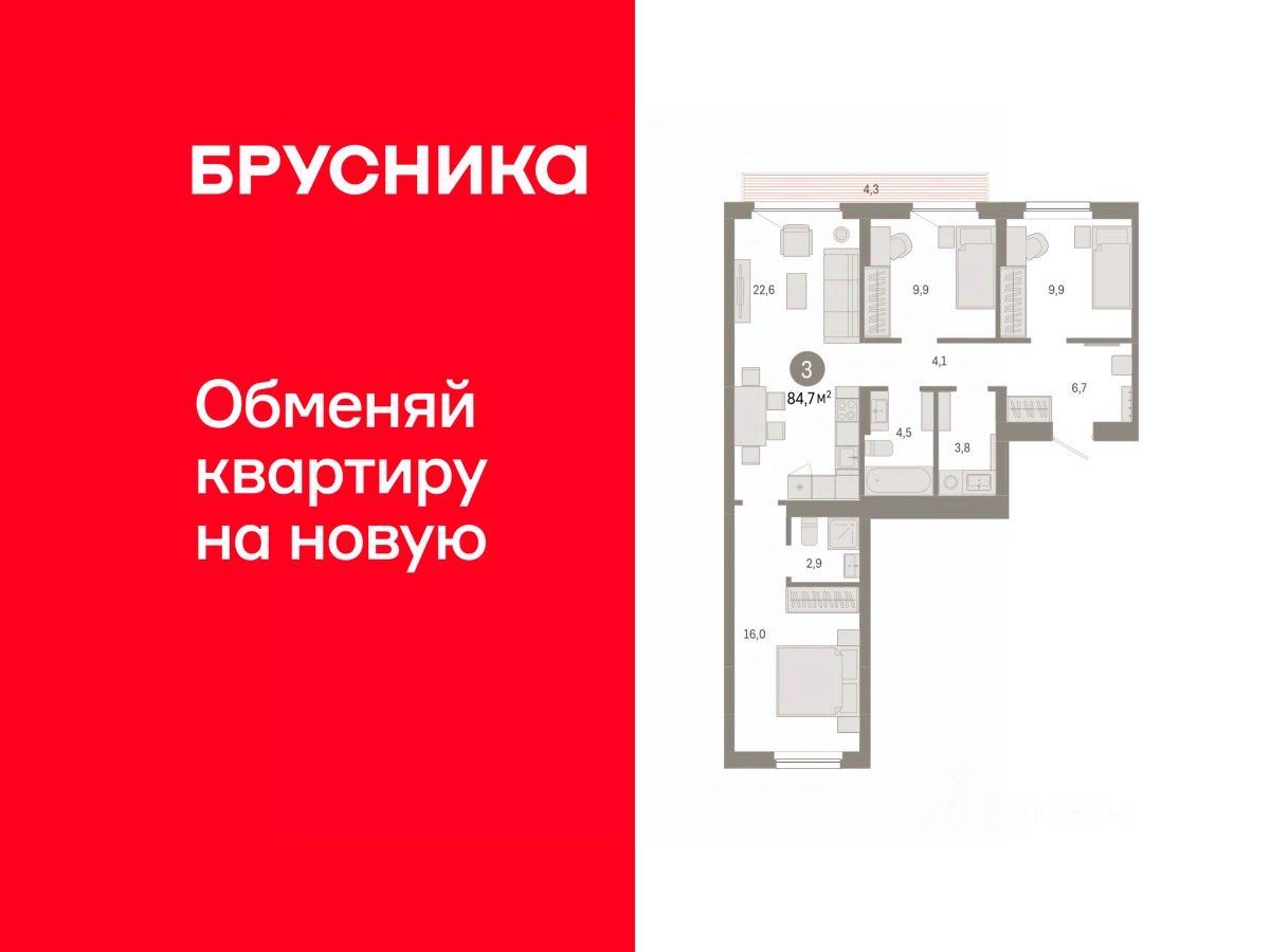 Квартира с кухней-гостиной и тремя спальнями в квартале ''Лебедевский''. Особенности планировки: балкон, окна на две стороны, предчистовая отделка, разнесённые спальни. квартиры в нашей базе: ЛБД01.1-Ж2.4.8.