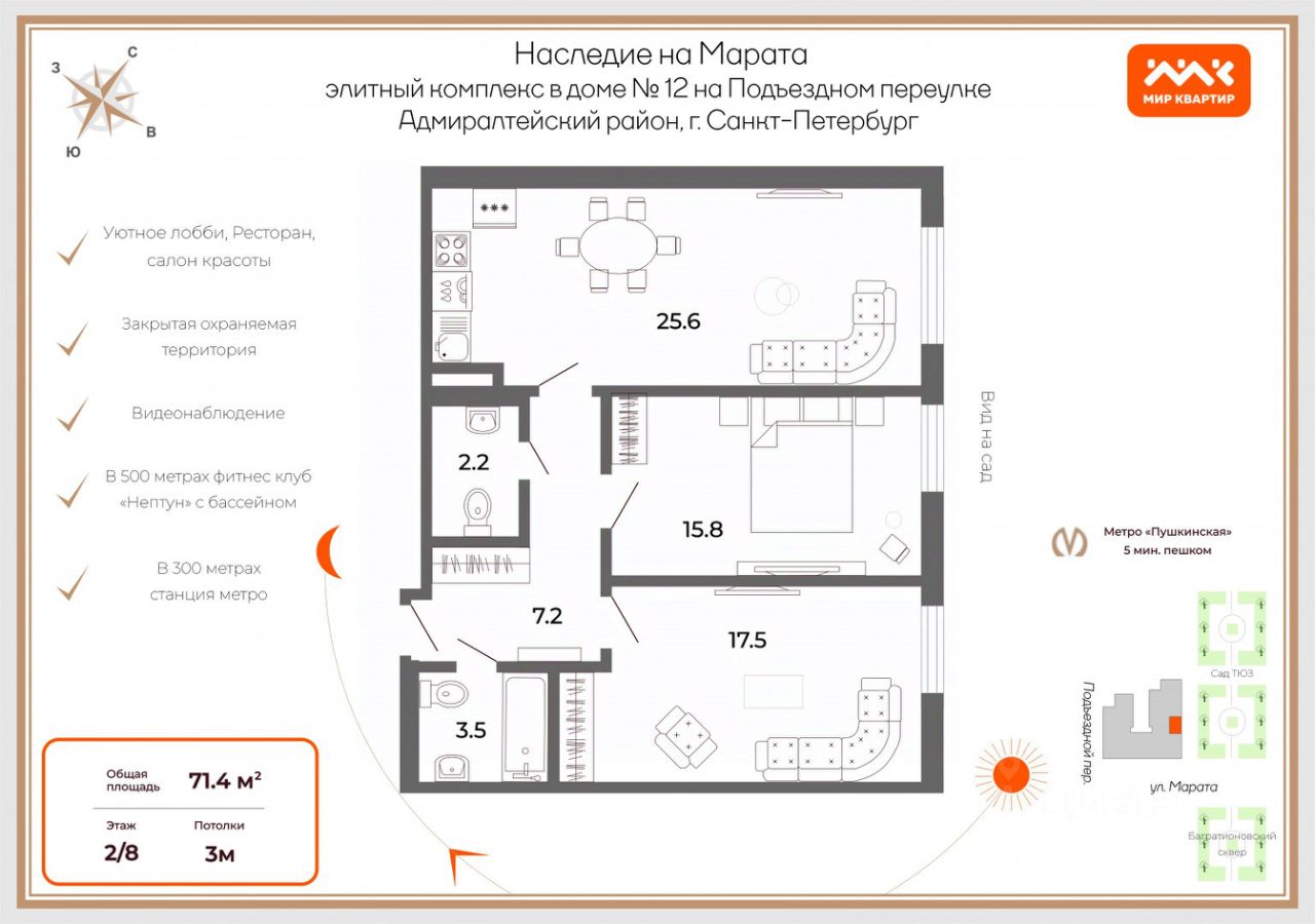 Арт. 94725993 В устье улицы Марата, ранее именуемой Преображенской, на пересечении с Подъездным переулком, в окружении скверов построен новый респектабельный комплекс апартаментов для жизни - ''Наследие на Марата''.