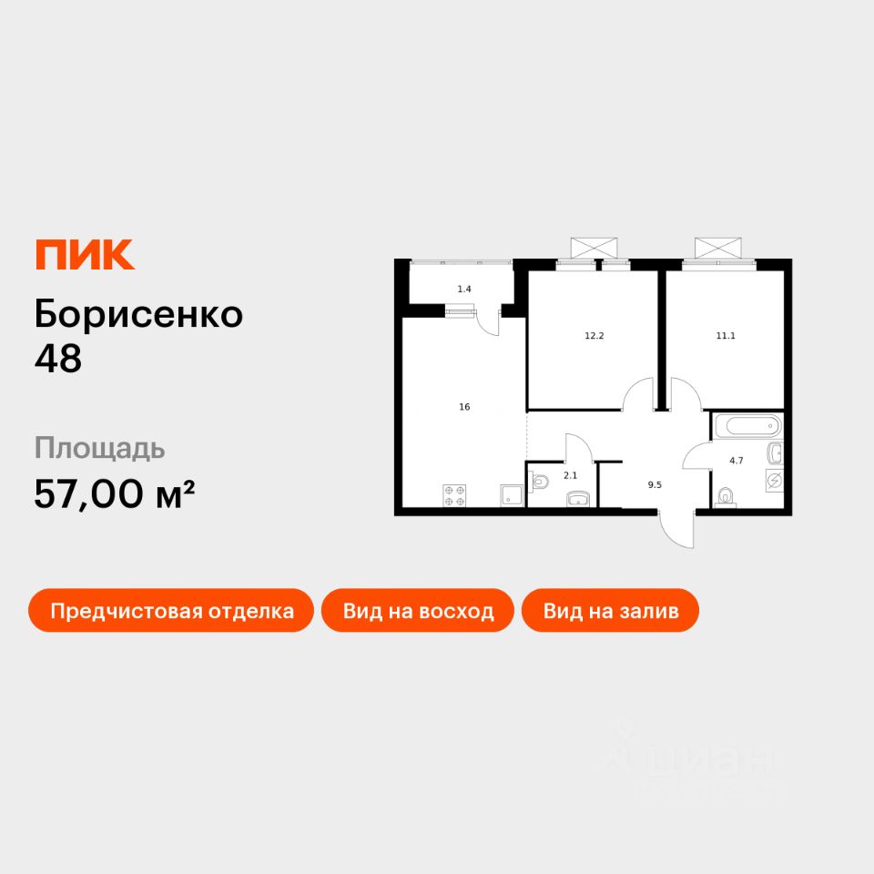 Продаётся 2-комн. квартира площадью 57 кв.м на 25 этаже 28 этажного дома (Корпус 2, Секция 2) проекта ПИК Борисенко 48. Светлый просторный подъезд на уровне земли, функциональная планировка, большие окна, предчистовая отделка.
