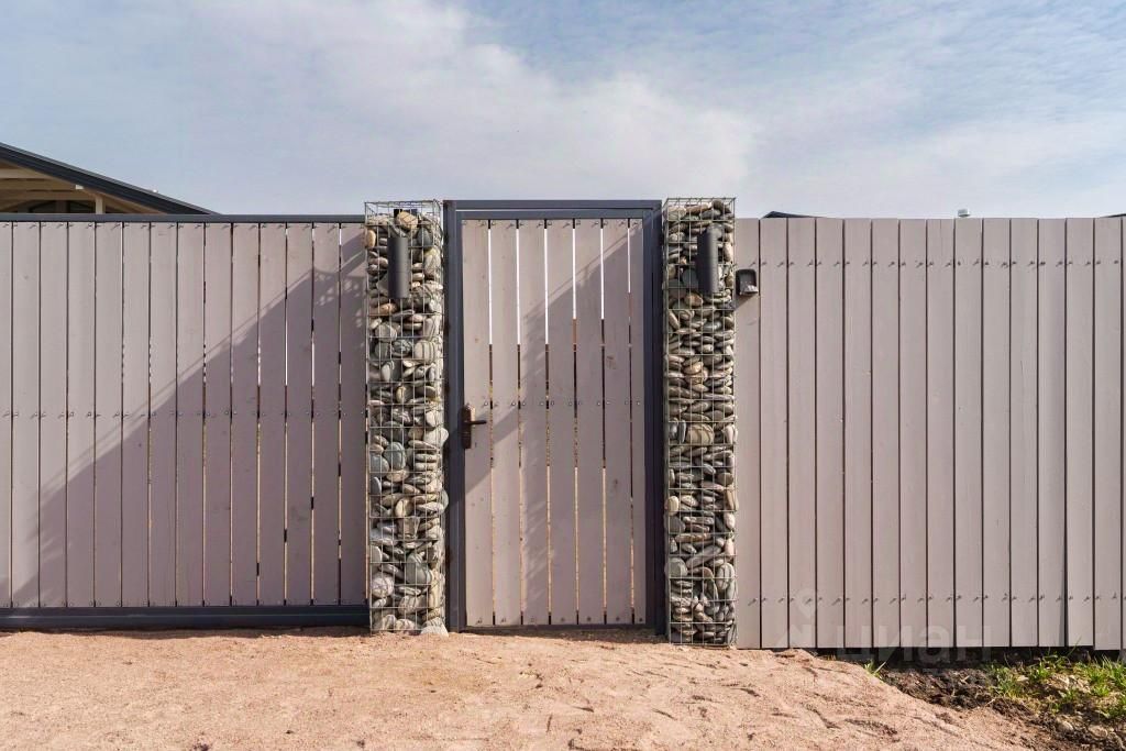 Участок правильной формы, деревянный забор оснащен откатными воротами.
