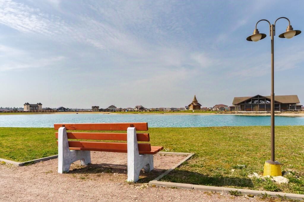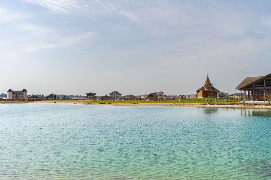 Озеро с песчанным пляжем и детской площадкой. Часовня.