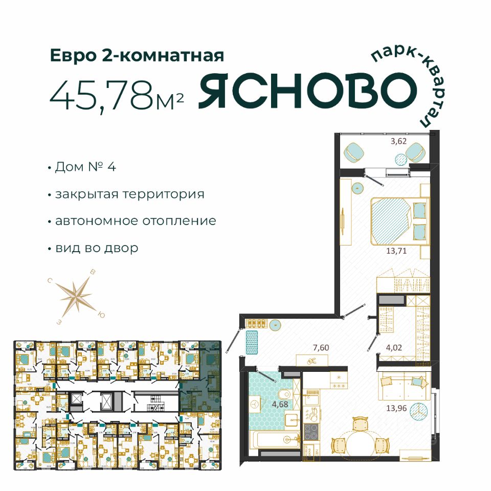 О жилом комплексе: — Зелёные аллеи и закрытые дворы без машин — Спортивные и детские площадки — Велодорожки, зоны для отдыха и прогулок — Современные входные группы и дизайнерские МОПы