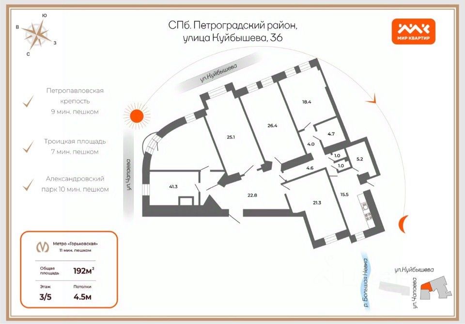 Арт. 96370487 Предлагаем к продаже 6-ти комнатную квартиру общей площадью 192 кв.м. в историческом центре Санкт-Петербурга, в самом сердце Петроградского района. Легким прогулочным шагом за 9 минут вы оказываетесь у Петропавловской крепости, в 10 минутах Александровский парк, а буквально через улицу Петроградская набережная, где монументально застыла Аврора! Дом имеет статус памятника архитектуры. В 2020 году проведен капитальный ремонт всех инженерных систем, коммуникаций, лифтового оборудования, крыши, подвальных помещений и фундамента. Перекрытия железобетонные, материал стен кирпич. Построен по индивидуальному проекту в 1913 году. Перекрытия железобетонные, материал стен кирпич. В квартире расположены 2 камина, в больших комнатах по 2 окна, что позволит разделить их при желании и задумке дизайнера. Главная особенность квартиры - это эркерный балкон из которого открывается вид на набережную и элитный ЖК Аврора со шпилем. В доме 2 лестницы: парадная и черная ( в хорошем состоянии). Высота потолков 3.5 метра! Квартира подойдет, как для истинного ценителя имперских домов с высокими потолками, огромными комнатами, так и для предпринимателей, которые задумают отремонтировать и сдавать посуточно, учитывая, что Санкт-Петербург туристическая мекка, вложения оправдают себя со сторицей! Прямая продажа! Один собственник! Документы готовы! Ждем на просмотр!