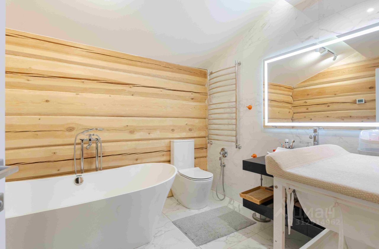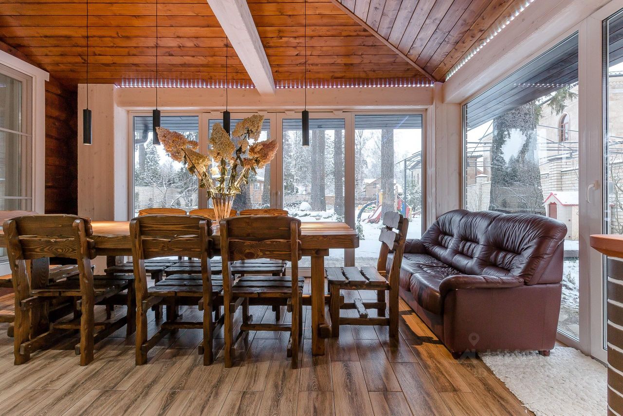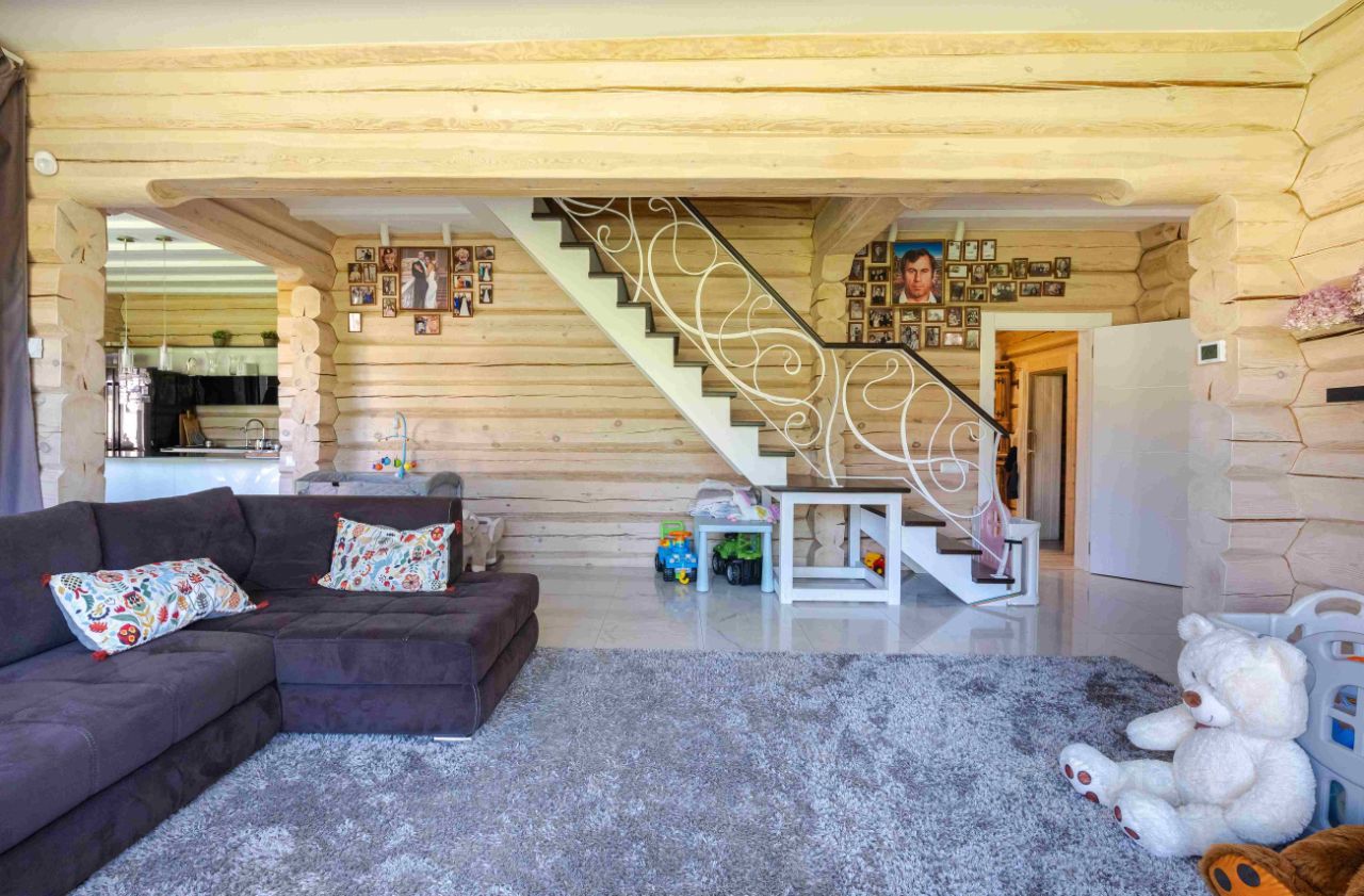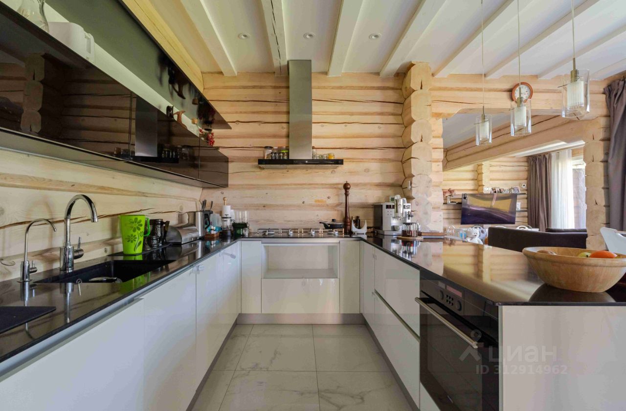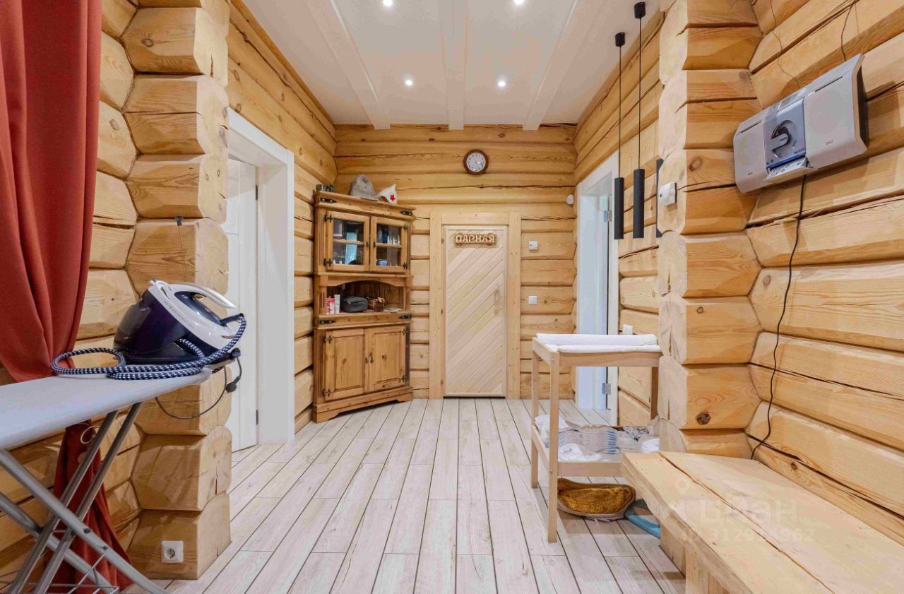 Основной дом: - Площадь: 262 м² - Фундамент: тёплая ж/б плита (350 мм). - Стены: лафет из архангельской сосны (диаметр 400-450 мм). - Внутренняя отделка: шлифовка, окраска белёным воском (белёный дуб), швы обработаны немецким акриловым герметиком. - Полы: первый этаж — плитка из итальянского керамогранита, тёплый водяной пол, второй этаж — тёплый пол в санузле (керамогранит). - Лестница: бук с авторскими коваными перилами. - Окна: деревянные (лиственница) с тройным стеклопакетом, немецкая фурнитура, панорамные окна на первом этаже. - Оснащение: умный дом, климат-контроль, встроенная мебель и техника, интернет (оптоволокно), видеонаблюдение, сигнализация (вневедомственная охрана).