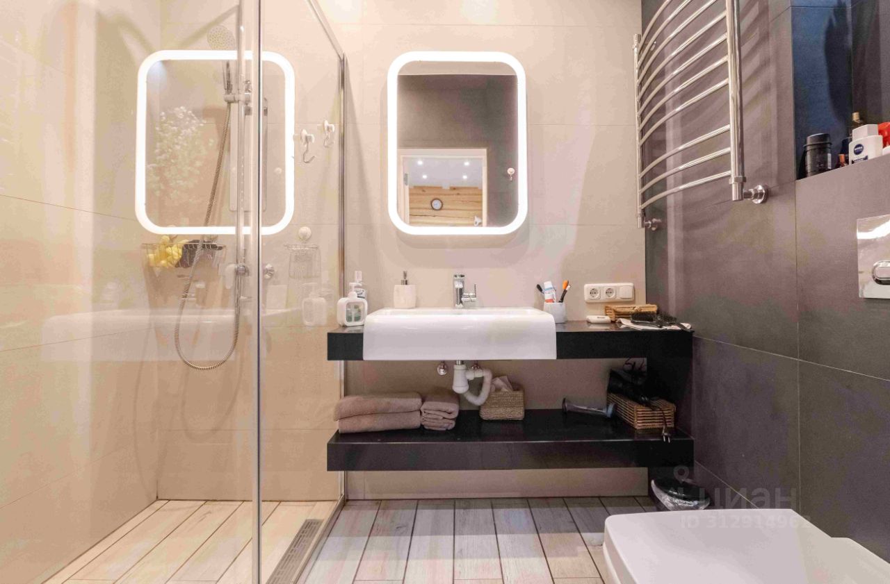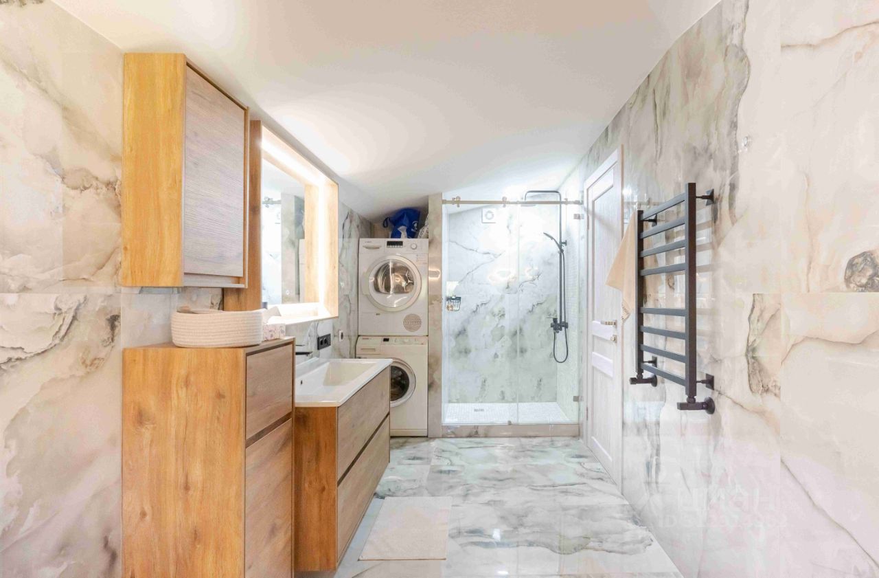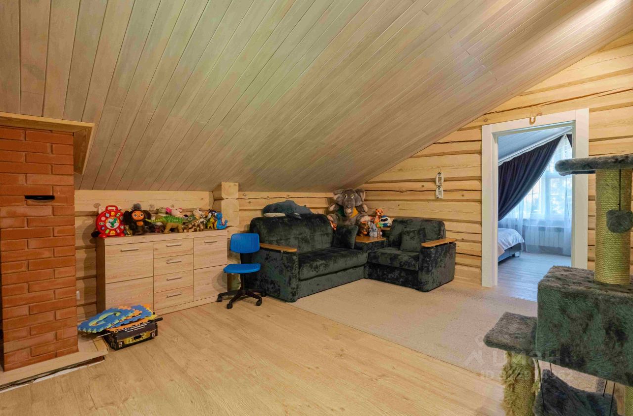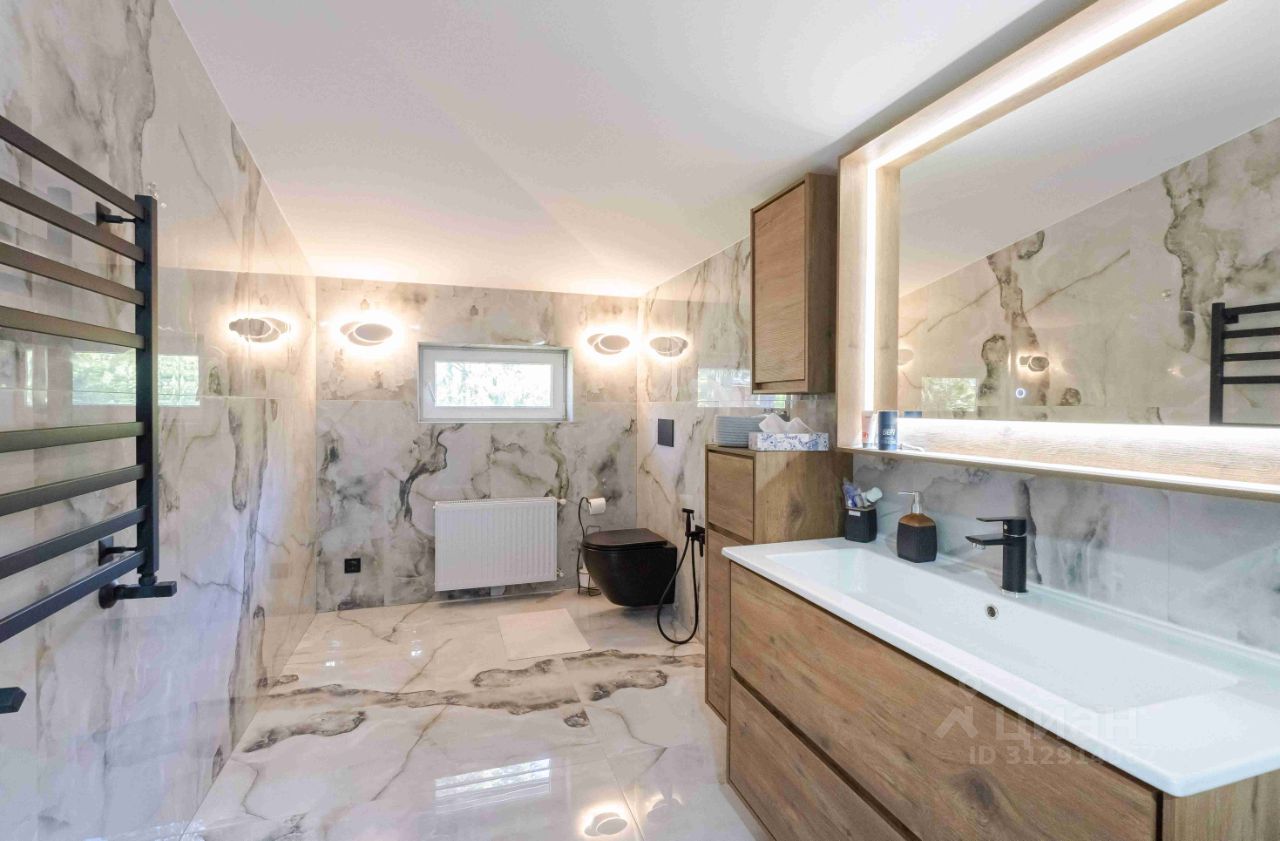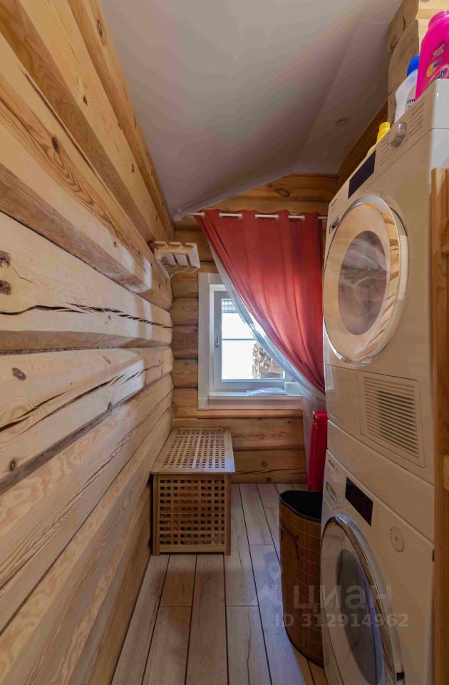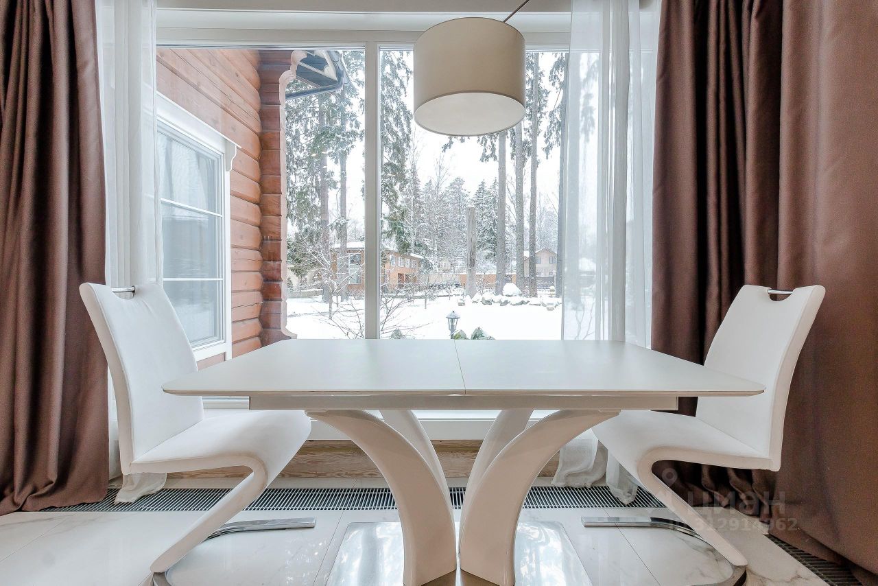 Основной дом: - Площадь: 262 м² - Фундамент: тёплая ж/б плита (350 мм). - Стены: лафет из архангельской сосны (диаметр 400-450 мм). - Внутренняя отделка: шлифовка, окраска белёным воском (белёный дуб), швы обработаны немецким акриловым герметиком. - Полы: первый этаж — плитка из итальянского керамогранита, тёплый водяной пол, второй этаж — тёплый пол в санузле (керамогранит). - Лестница: бук с авторскими коваными перилами. - Окна: деревянные (лиственница) с тройным стеклопакетом, немецкая фурнитура, панорамные окна на первом этаже. - Оснащение: умный дом, климат-контроль, встроенная мебель и техника, интернет (оптоволокно), видеонаблюдение, сигнализация (вневедомственная охрана).