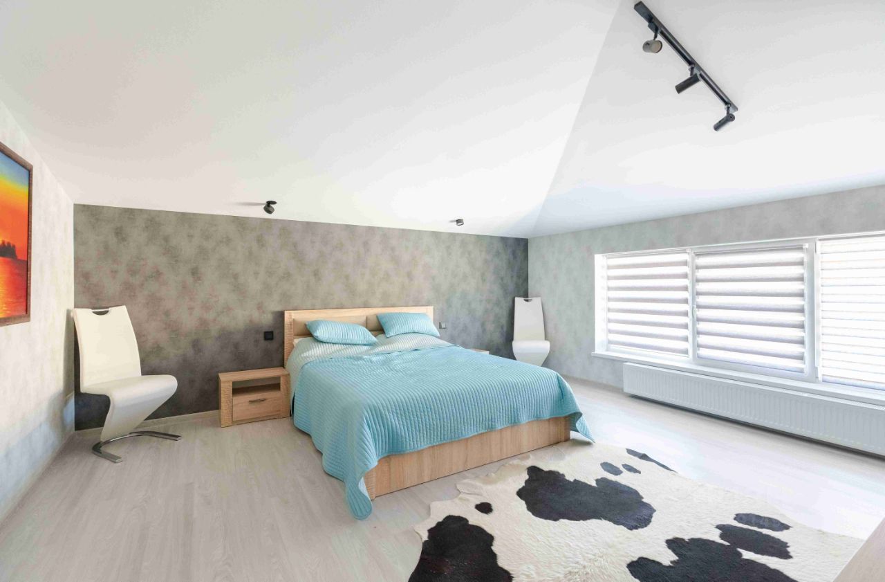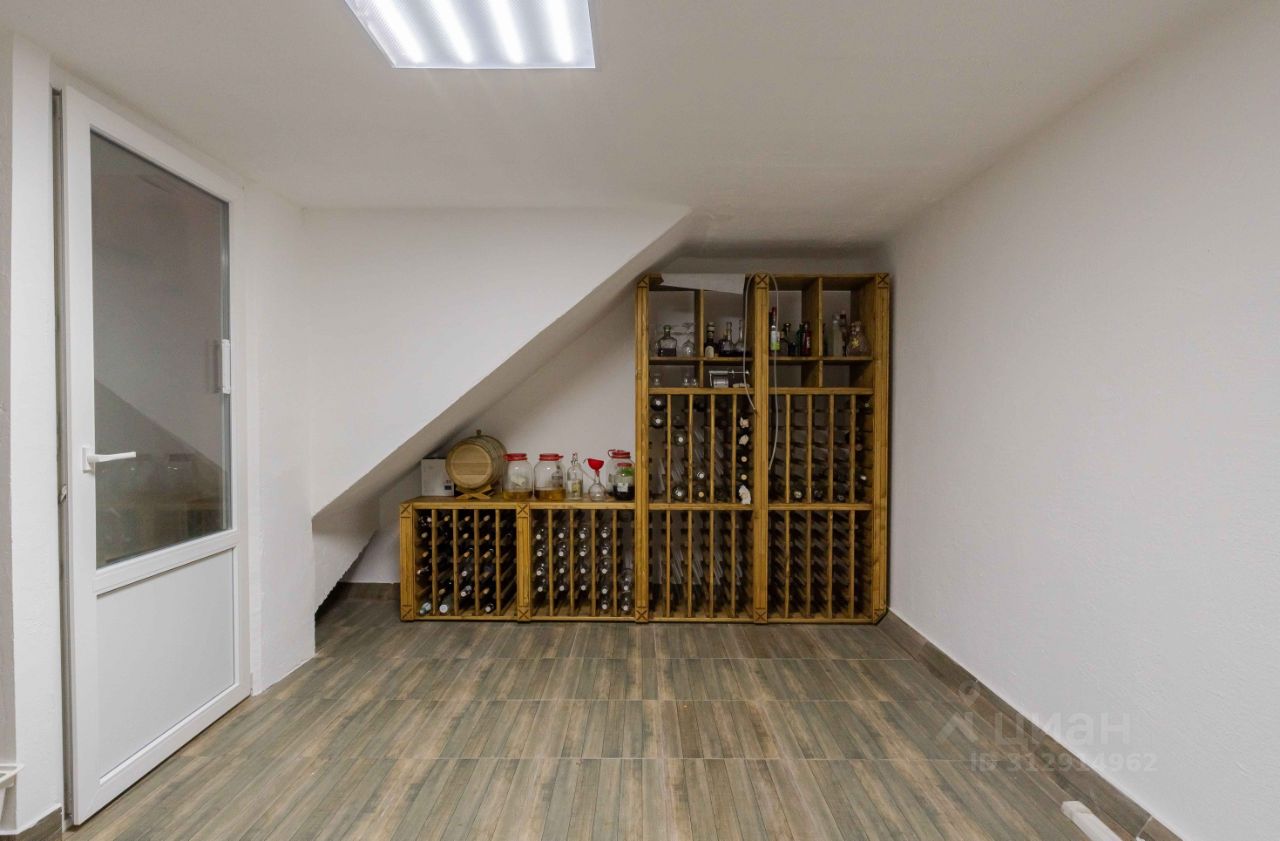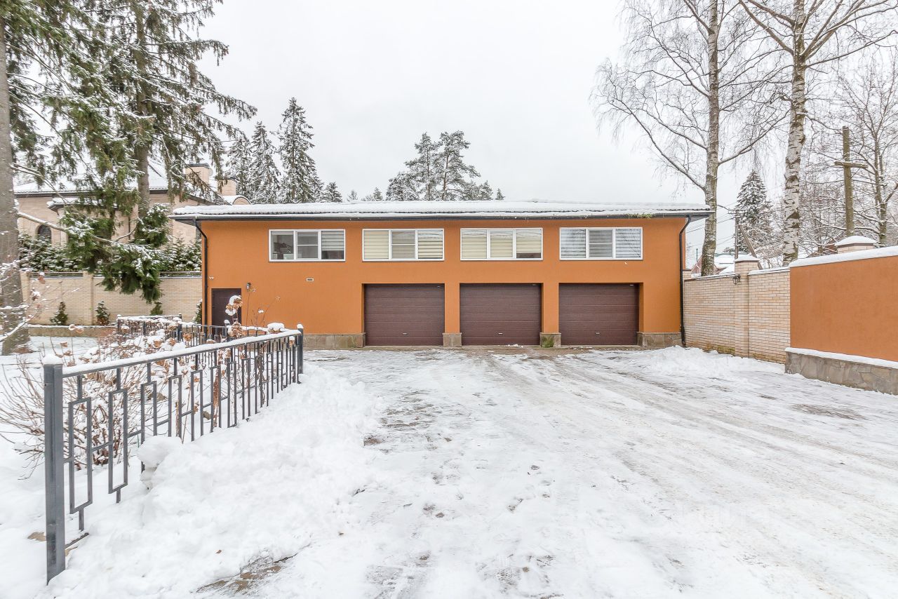 Планировка: - Первый этаж: гараж на три автомобиля с автоматическими воротами, системой слива, мастерской, системой хранения, санузел, комната для консервирования/вина, газовая котельная. - Второй этаж: кабинет, гостиная с кухней, спальня, гардеробная, санузел с душевой кабиной. - Подвал 25 м² с приточно-вытяжной вентиляцией.