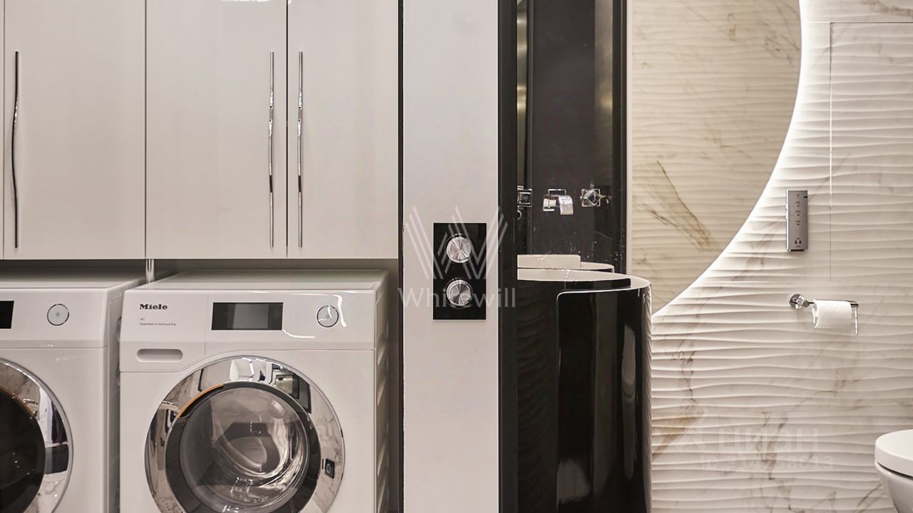 Встроенная техника на кухне и постирочной Mille, системы хранения производства Германия, мебель под заказ провозилась из Европы.