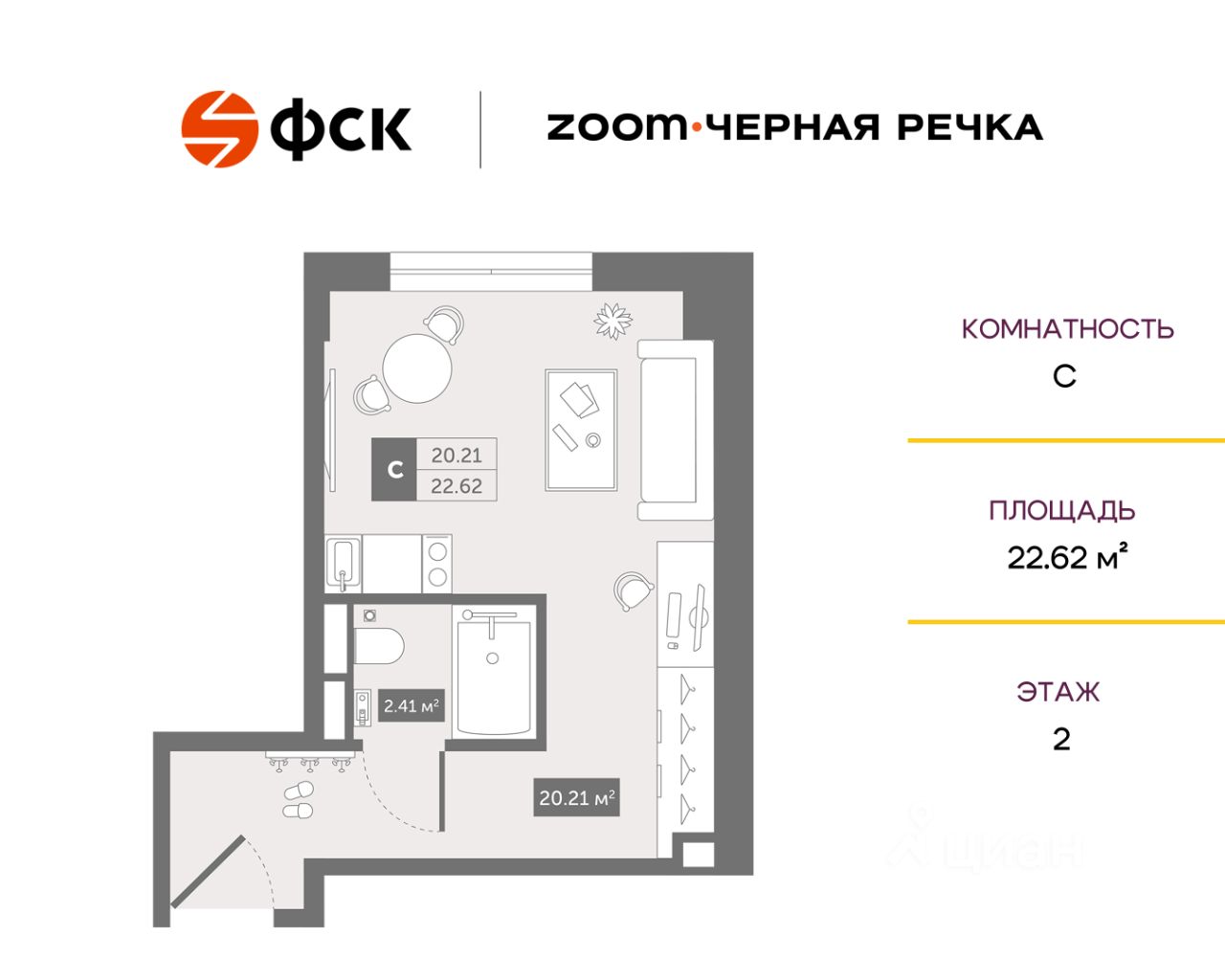 продам 1-к, Коломяжский проспект, 46 115 882 ₽