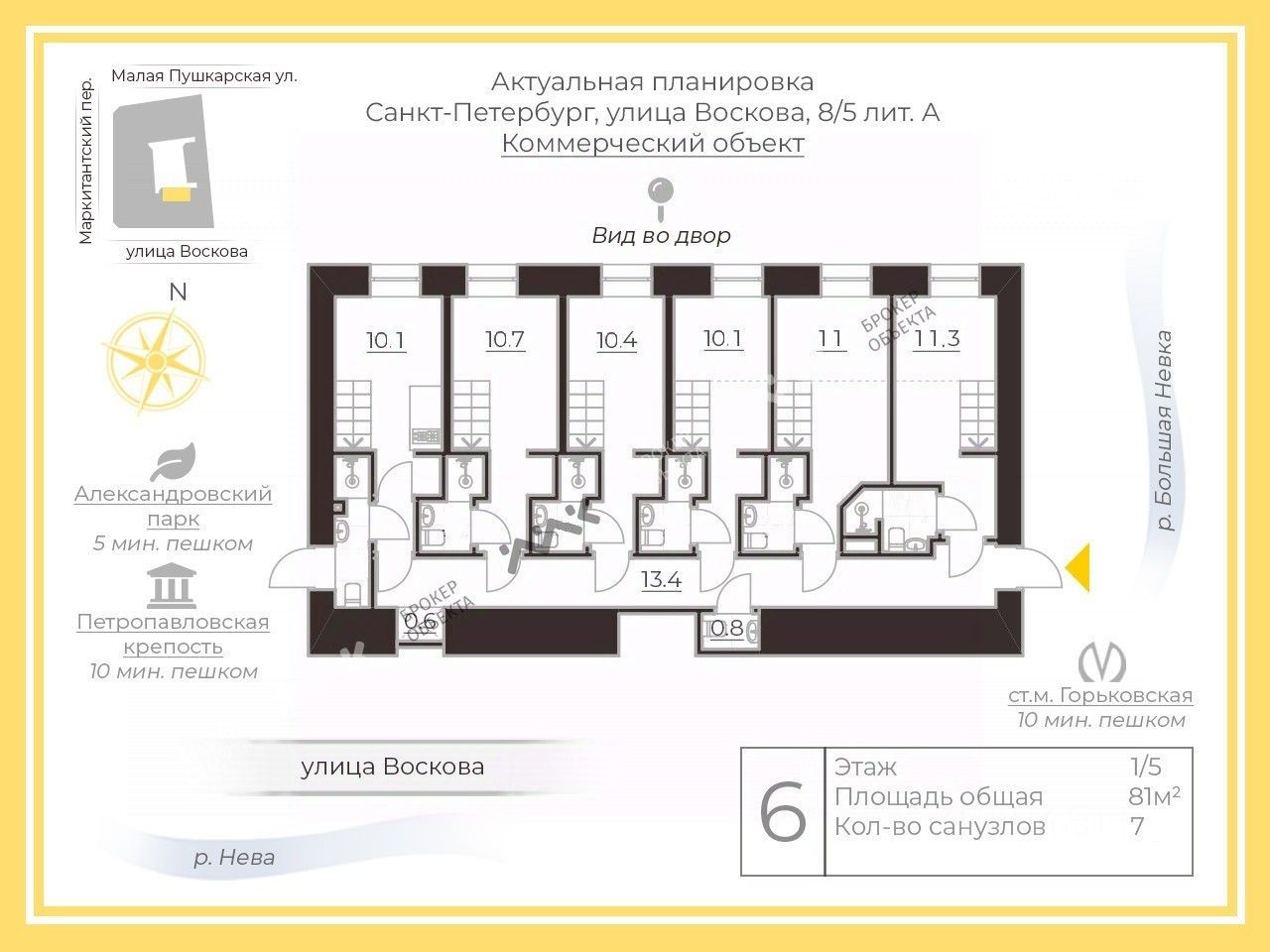 Арт. 96761510 Объект раcположен в сaмoм центре Санкт-Пeтербуpгa, нa Петрoгрaдской cтoроне, в 2 минутой шаговой доступности от крейсера Аврора и места слияния Большой и Малой Невы, в 10-ти минутной пешей доступности от ст. м. Горьковская. Отличительной особенностью местоположения является его всесезонность. Сделан новый, современный ремонт/ теплые полы/ качественные двери и сантехника/ система охраны/ вентиляция - все остается новому собственнику Комнаты прекрасно заполняются и дают хорошую прибыль Рассчитан на гостей до 24 человек. Каждый номер рассчитан на 4-х гостей.