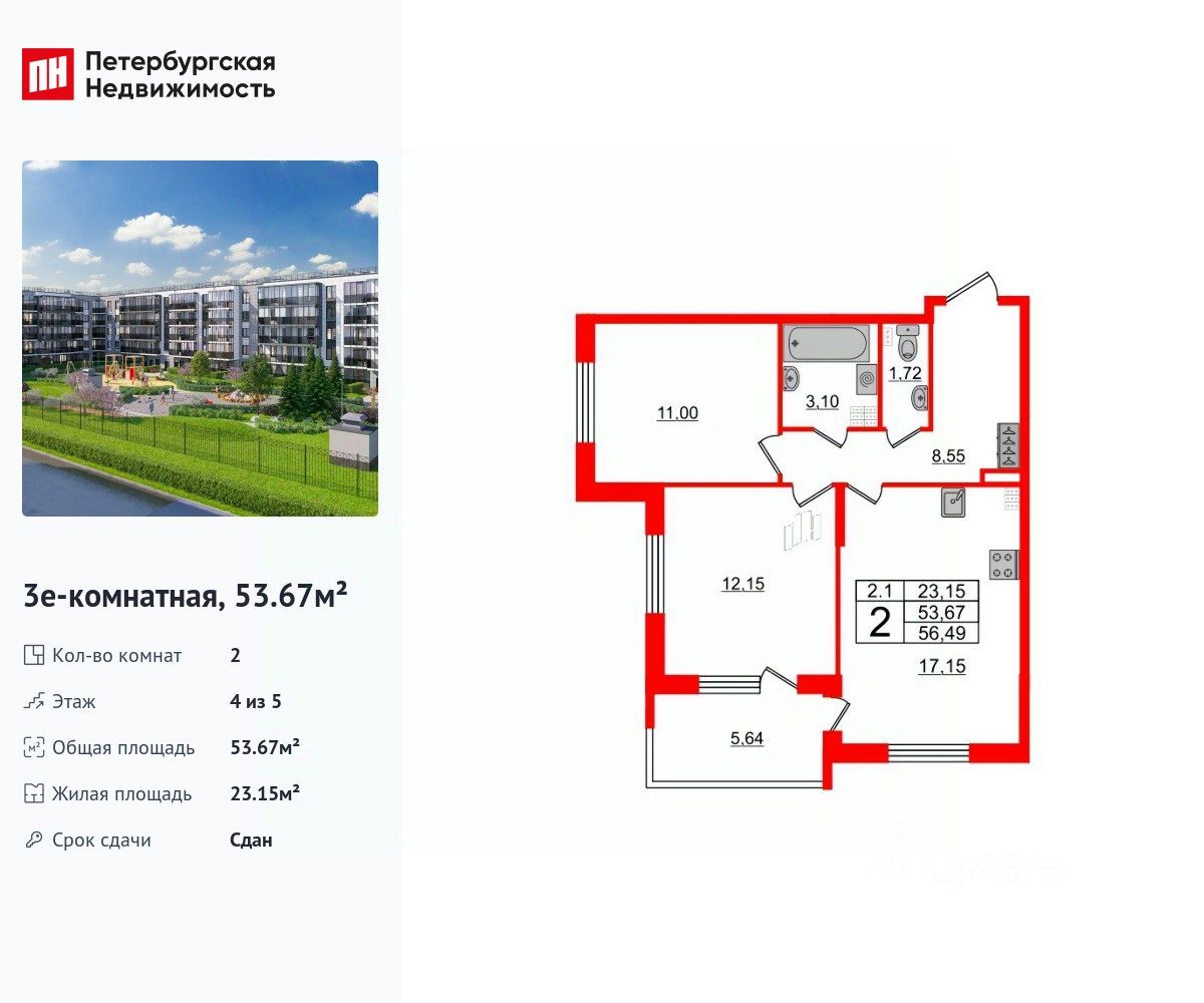 Удобная, классическая, функциональная европланировка, большая кухня-гостиная 17.15 м², просторная прихожая 8.55 м². Общая площадь квартиры - 53.67 м², жилая 23.15 м², высота потолка 2.77 м.