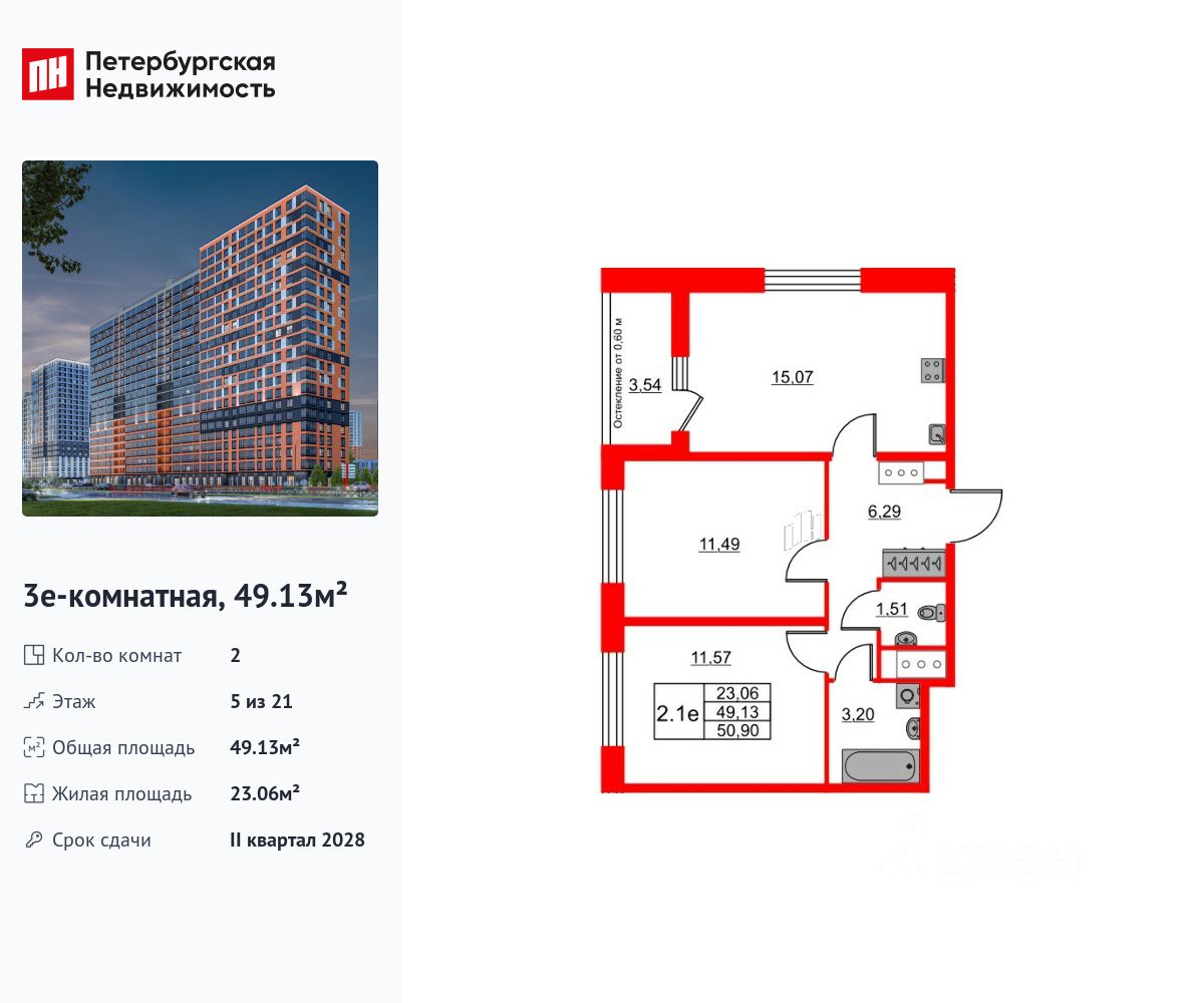 Удобная, классическая, функциональная европланировка, большая кухня-гостиная 15.07 м², вместительная прихожая 6.29 м². Общая площадь квартиры - 49.13 м², жилая 23.06 м², высота потолка 2.77 м.