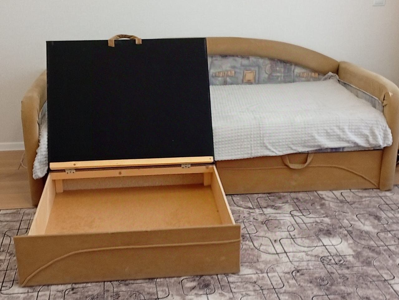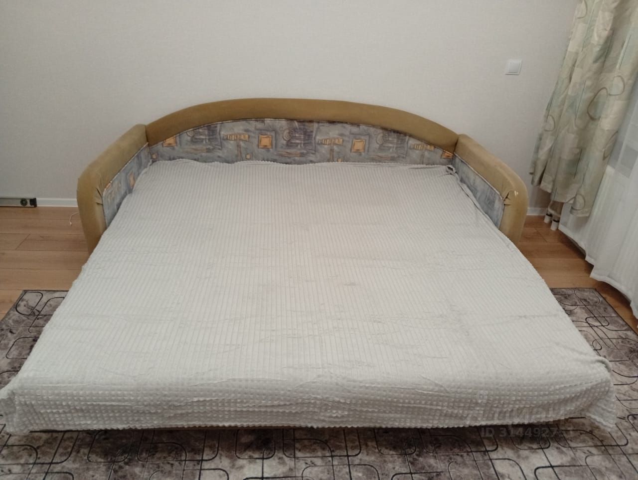 Из мебели и техники все необходимое. Достаточно мест для хранения. Огромная тахта (спальное место 2х2)в разобранном состоянии. Планировка студии удобная и функциональная, совмещенный санузел оборудован ванной. Кухня занимает 5 кв. м, что позволяет разместить все необходимые вещи и удобно готовить.