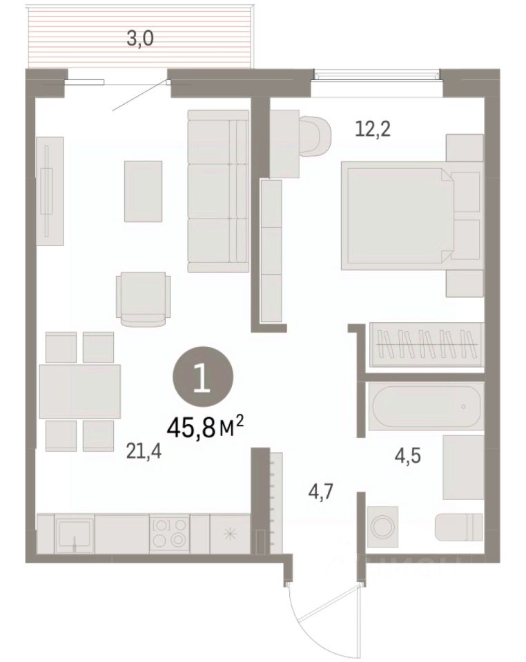 Просторная 1-комн. квартира с предчистовой отделкой в ЖК ''Дом Кино'' на 13 этаже. Общая площадь: 45.75 кв.м., жилая: 12.2 кв.м., площадь просторной кухни-гостиной: 21.3 кв.м. Все окна выходят на одну сторону. В квартире один балкон, один совмещенный санузел. Высота потолков 2.7 м.