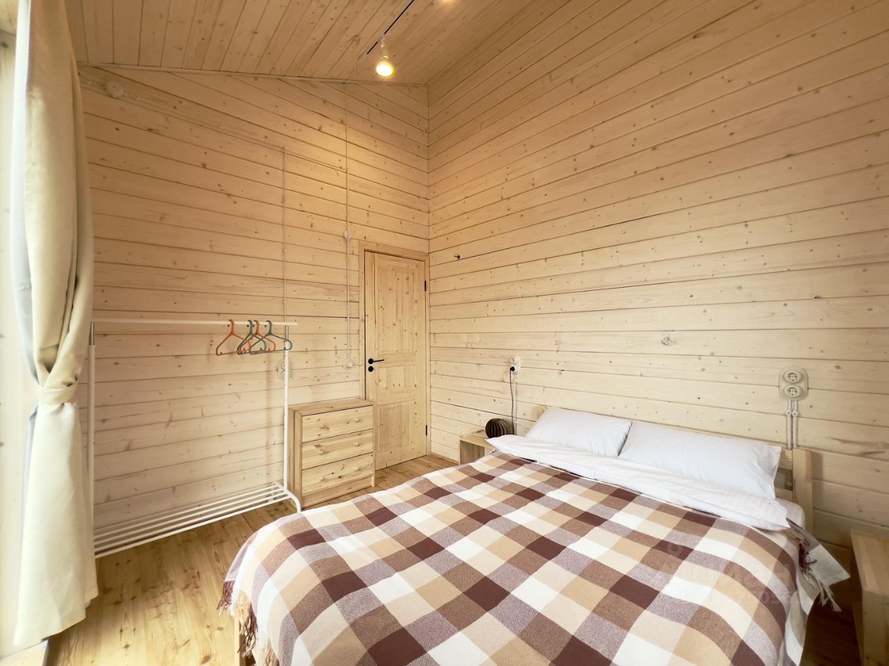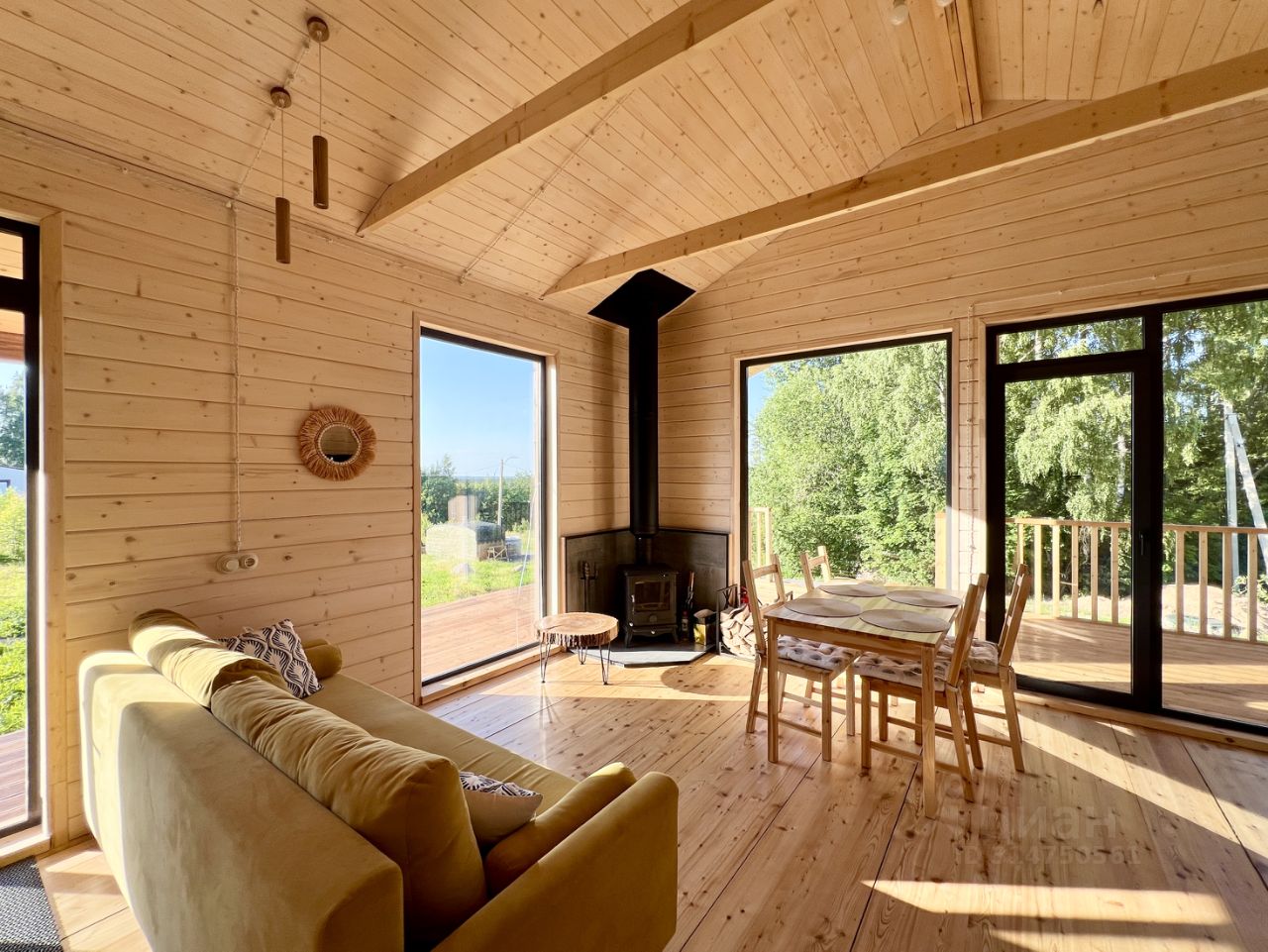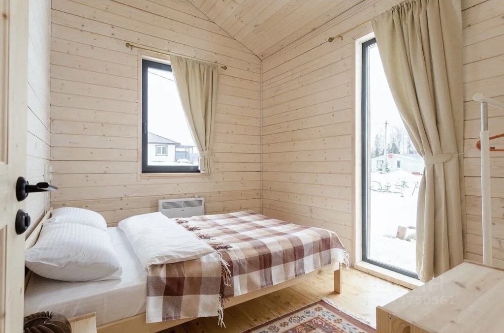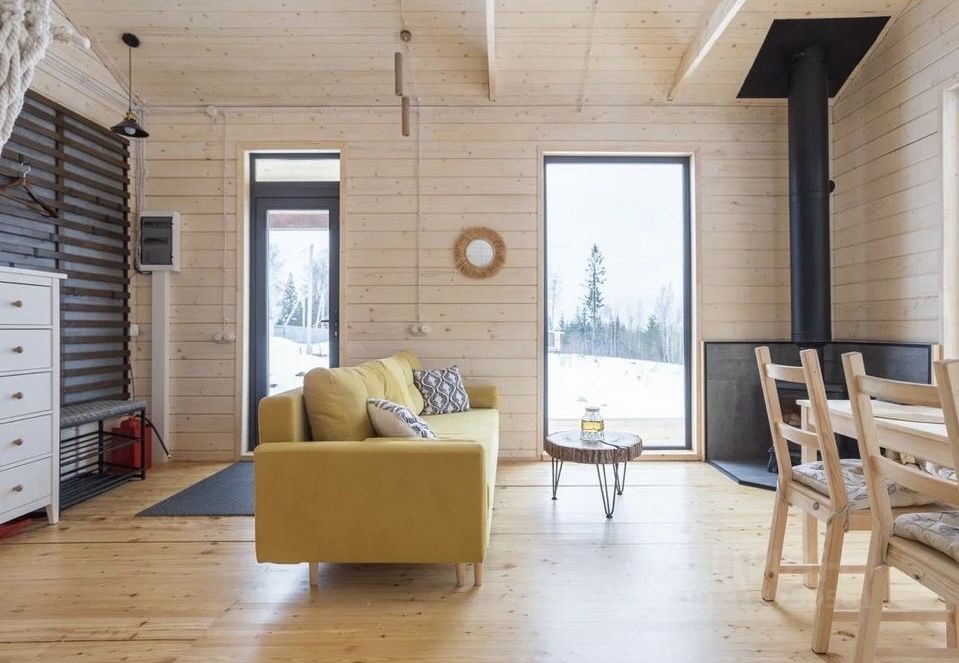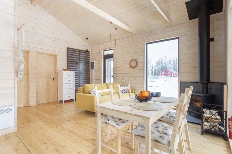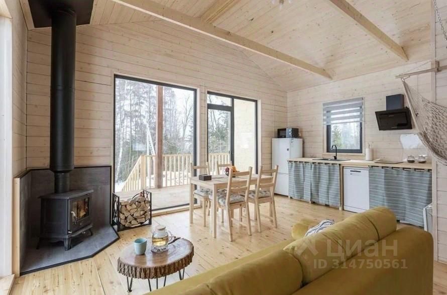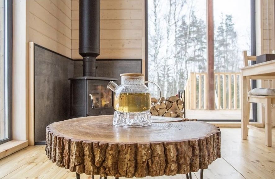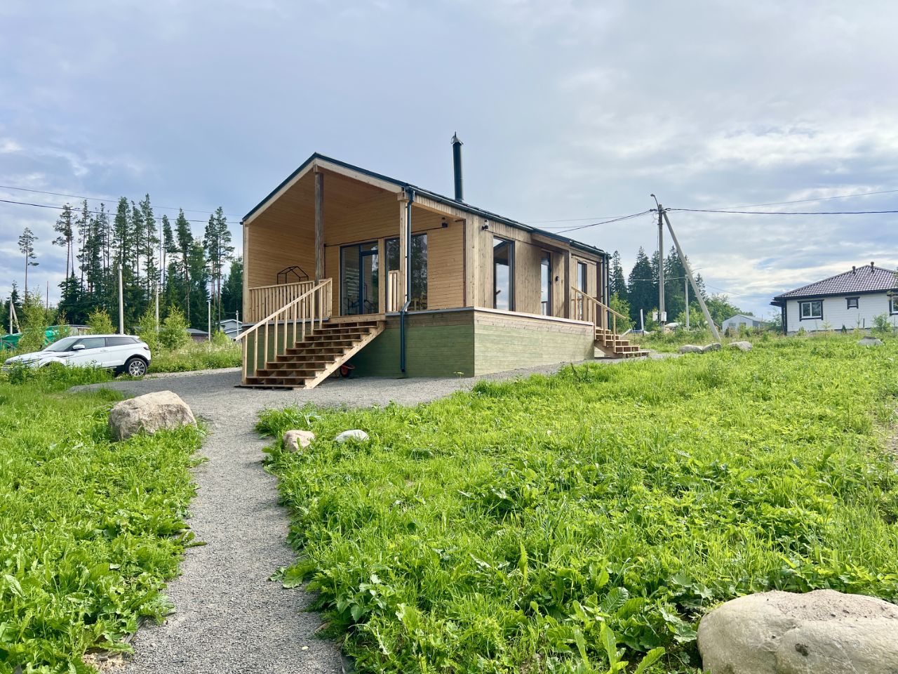 Планировка включает кухню-гостиную с камином, две спальни, ванную комната, просторную терраса. Панорамные окна дома выходят в сторону леса. Дом укомплектован всем необходимым для комфортного проживания. Предусмотрен подогрев полов, wi-fi, баня на дровах, купель.