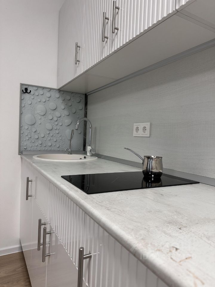 Квартира, площадью 27.1 м2, с двумя окнами, разделена на две зоны: кухню и гостиную.